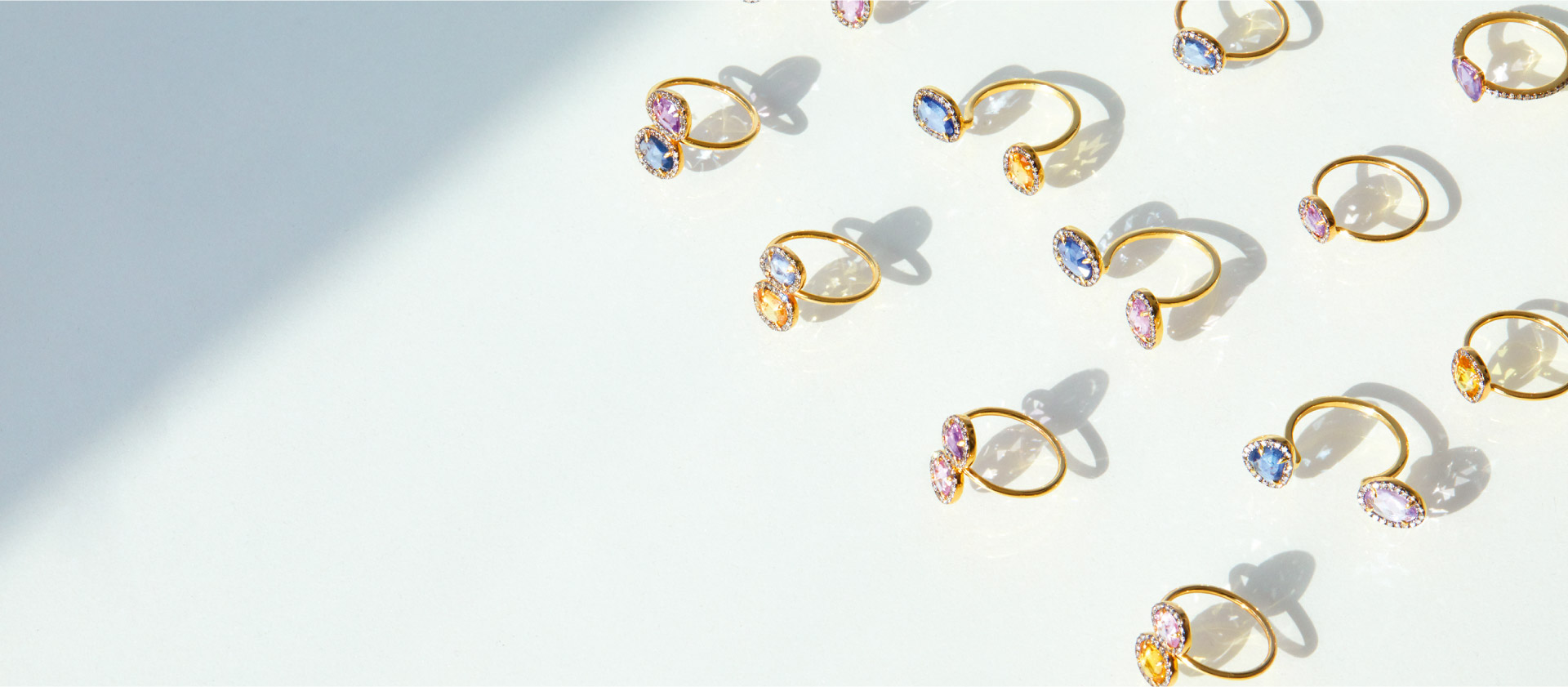 2周年を記念し、“elafonisi”のマルチサファイアを使用したリング5型が発売。感謝の気持ちとスタッキングして着けていただきたいという想いを込めて、2本以上のご購入で20%OFFに。(前列から順に)37,400yen / 38,500yen / 27,500yen / 29,700yen