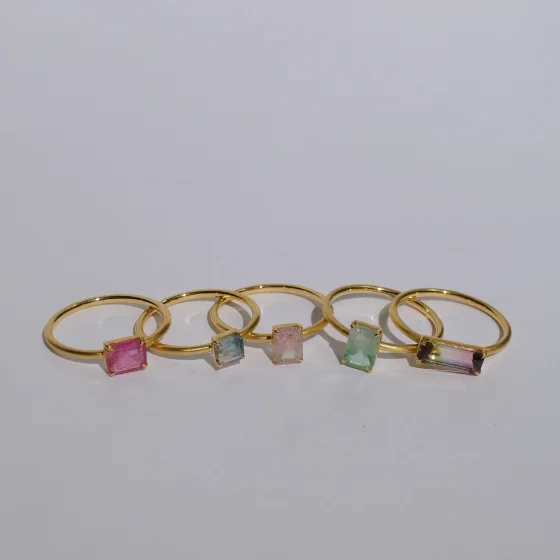 一つひとつ異なる色とレクタングルのフォルムを持つ、ほんのりペールがかったトーンのトルマリンを主役に、K10でお作りした一点もののリングです。[eden] 【8th Anniversary Limited】One of a kind K10 multi tourmaline ring 59,400yen