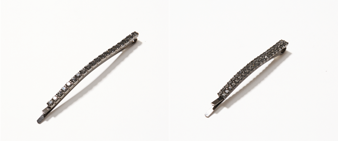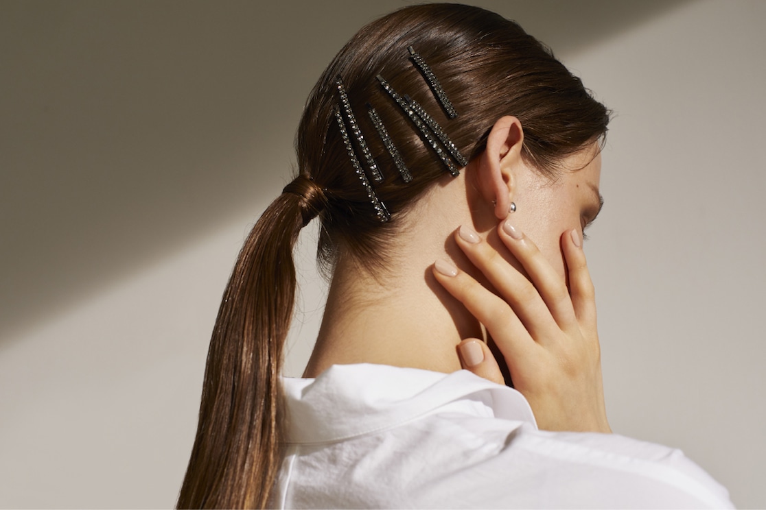 ヘアアクセサリーは、ブラウンダイヤモンド×ブラックロジウム素材を彷彿とさせる、ガンメタルカラーのクリスタルを配置したヘアピン。画像のようにたくさん着けるとモードな印象ですが、一本でも充分な存在感を放ちます。