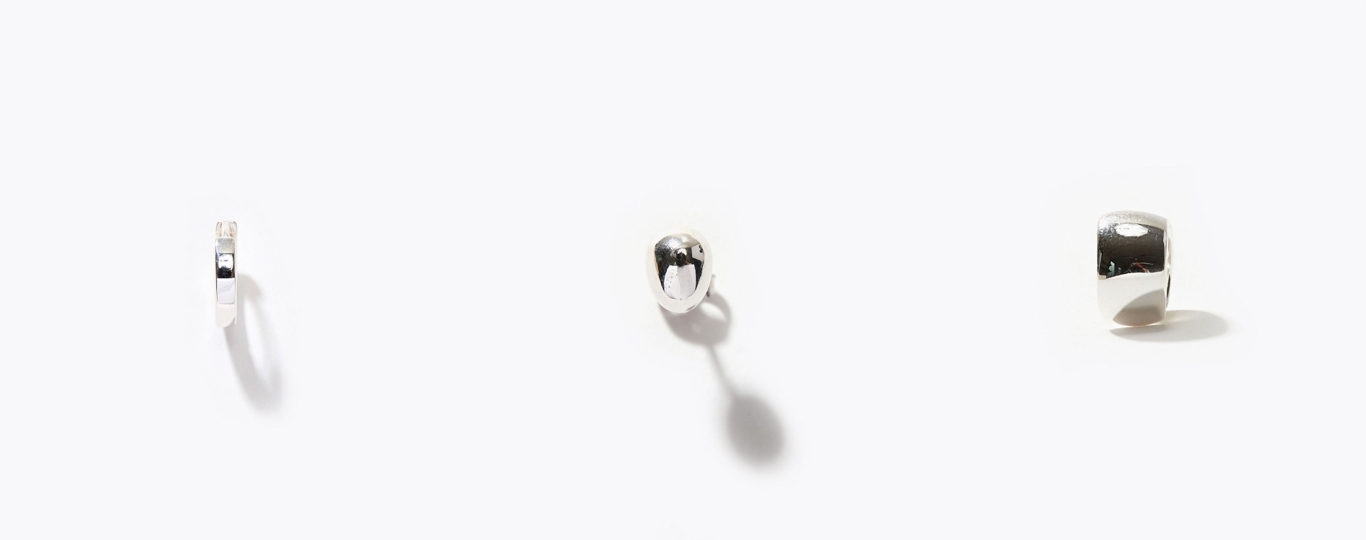 左は、便利なミニフープピアス。すっきりと見えるヒンジ型の金具にこだわり抜きました。真ん中は、豆粒のようなプチスタッドピアス。こちらも一つあるとスタイリングのエッセンスに。