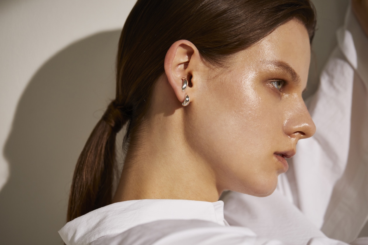 モデルが着用しているビーンピアスと、ビーン リバースピアス。ピアス穴が2つ開いている方は、こんな不思議な着け方もお楽しみいただけます。リバースピアスはもちろん、ストレートに正面向きでもお使いください。
