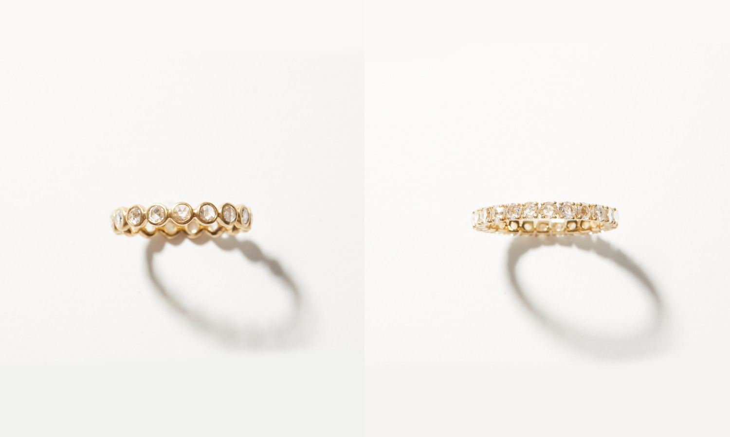 左は、柔らかな輝きを放つローズカットダイヤモンドを一粒一粒覆輪留めにしたエタニティリング。とても繊細で華奢な仕上げにとことんこだわりました。