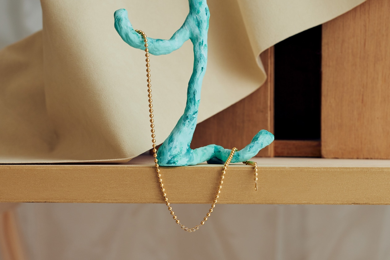 ダイヤモンドのモチーフとボールチェーンのサイズを合わせ、雫が滴るようなデザインに仕上げたピアスとチョーカーもご用意しました。太めのボールチェーンが新鮮で、冬のスタイリングにもしっかりと存在感を出してくれます。
