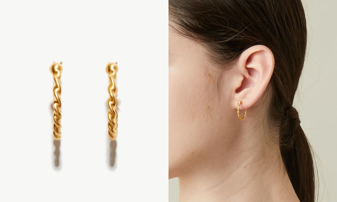 こちらは、先ほどご紹介したピアスと同じデザインで大きさと素材を変え、少し存在感のあるフープピアスに仕上げました。ひとつ前にご紹介したミニサイズのピアスと、こちらのフープピアスはチャームが通せるので、様々なアレンジをお楽しみいただけます。