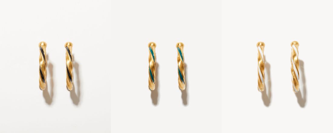こちらはツイストの溝にぐるりと一周、カラーエナメルをあしらったピアスとリング。古代の財宝からインスパイアされたデザインに、今の気分に合った彩りを添えました。