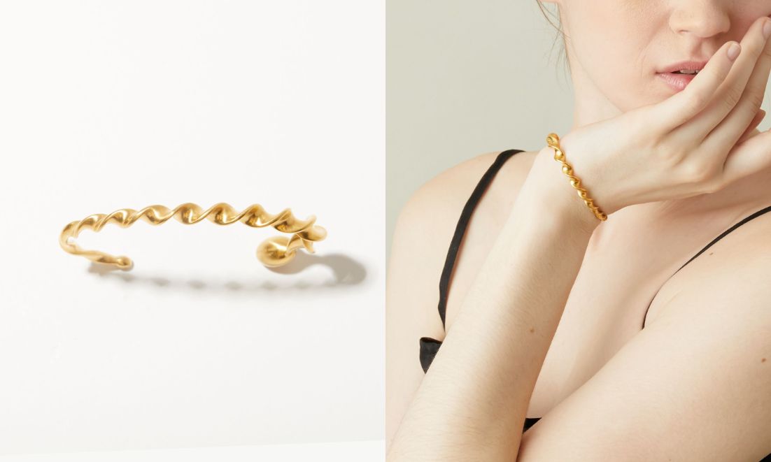 ツイストのスパイラルに、大きさのグラデーションをつけてデザインしたバングル。一本でも存在感があり、スタイリングを引き立てます。天然石のブレスレットと重ねていただくのもおすすめです。