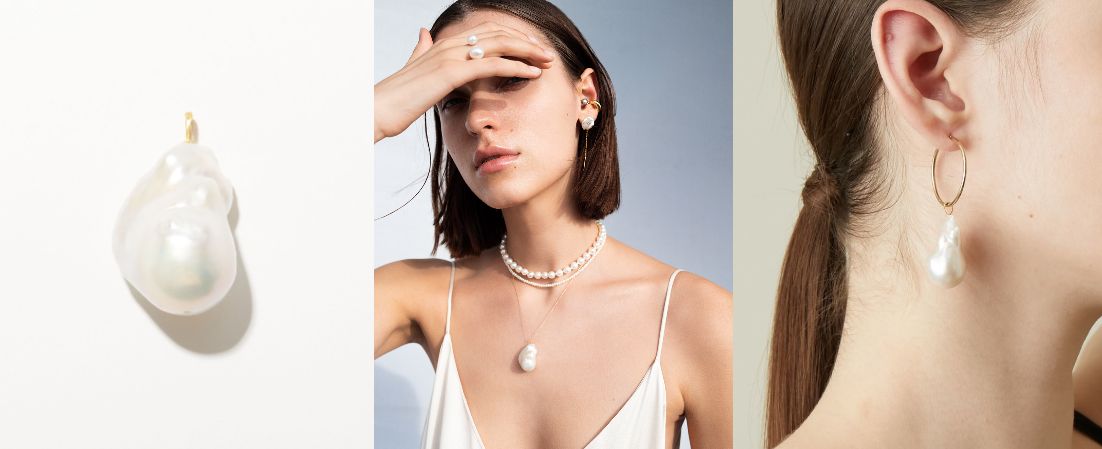 ころんとしたバロックシェイプの、伊勢志摩のアコヤパール。自然がうみ出す神秘の造形を、ミニマルなデザインに落とし込みました。