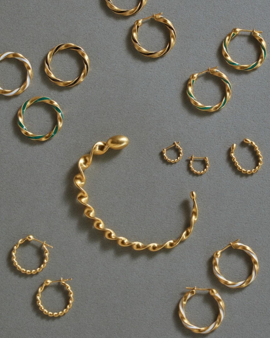 巻貝を彷彿とさせるツイストのデザインでお作りした、エキゾチックでユニークな新作のジュエリー。リングとピアス、イヤーカフ、バングルをご用意しました。