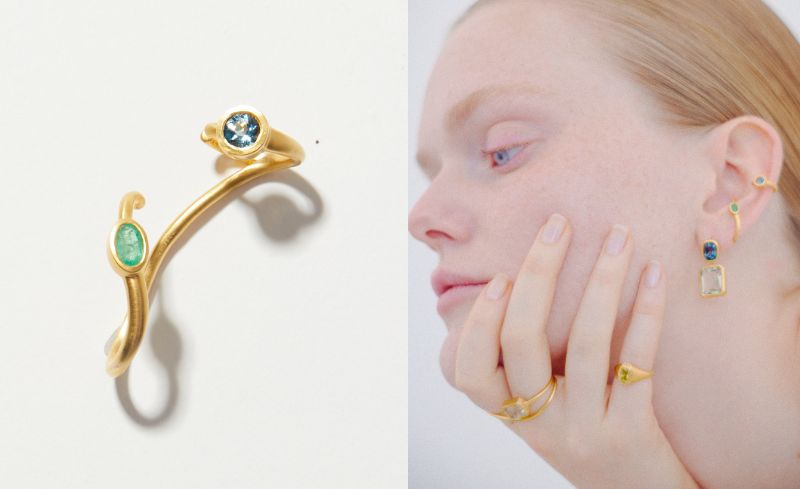ロンドンブルートパーズと、新芽のように鮮やかで、豊かな輝きを放つエメラルドを滑らかな曲線のラインに配したイヤーカフ。 耳のカーブに沿って美しい煌めきを放ちます。