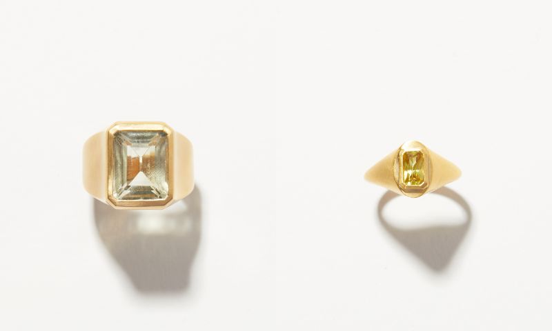左は、レクタングルカットのグリーンクォーツを配した、シンプルで存在感のあるシグネットリング。