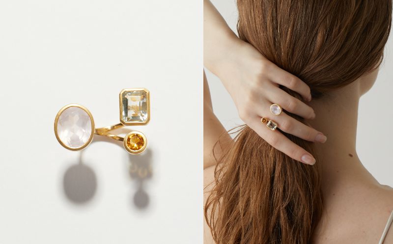 大きさやシェイプの異なる3つの石をリズミカルに配した、オープンリングもご用意しました。 こちらはペールトーンの優しい色合いの石が調和した、オープンリング。 オーバルカットの大振りのローズクォーツと、レクタングルのグリーンクォーツ、シトリンが奏でる瑞々しい表情をご堪能ください。