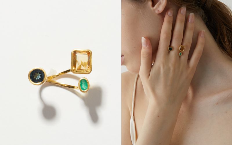 こちらはシックな色合いが魅惑的なオープンリング。 大振りのレクタングルカットのシトリンと、ラウンドカットのロンドンブルートパーズ、エメラルドを絶妙なバランスで配しました。