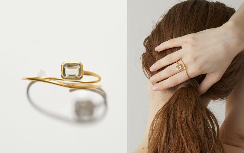 艶やかで瑞々しいレクタングルカットのグリーンクォーツを大胆に配したダブルフィンガーリングも登場しました。 大地の恵みを感じる、清らかなグリーンの煌めきと、柔らかな曲線が手元を立体的に彩ります。 こちらは左手の中指と人差し指に着けるデザインです。
