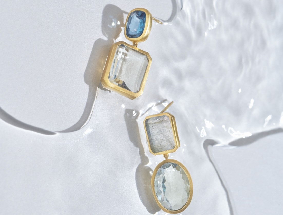 左は、深海を想わせるような青色が美しい、オーバルカットのロンドンブルートパーズ。 下にレクタングルカットのグリーンクォーツを連ねて、シックな印象に。