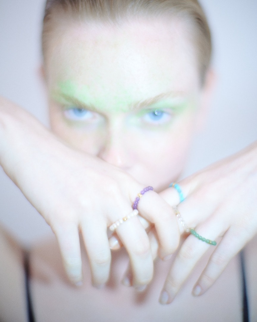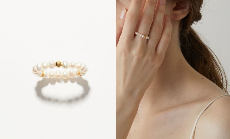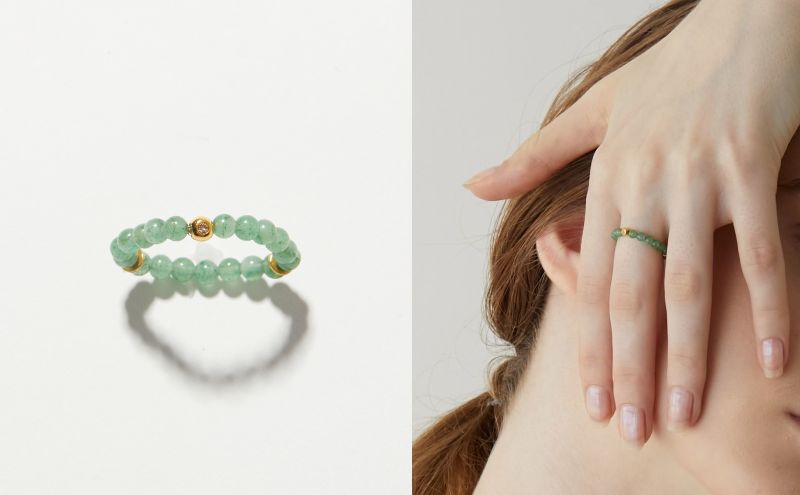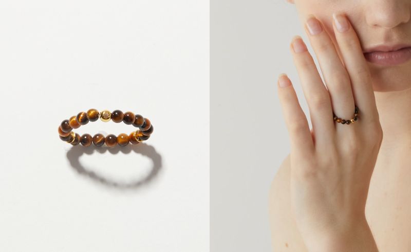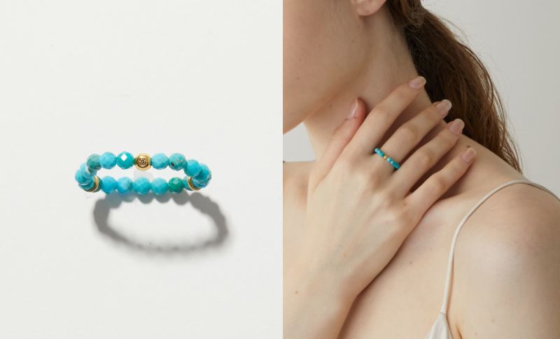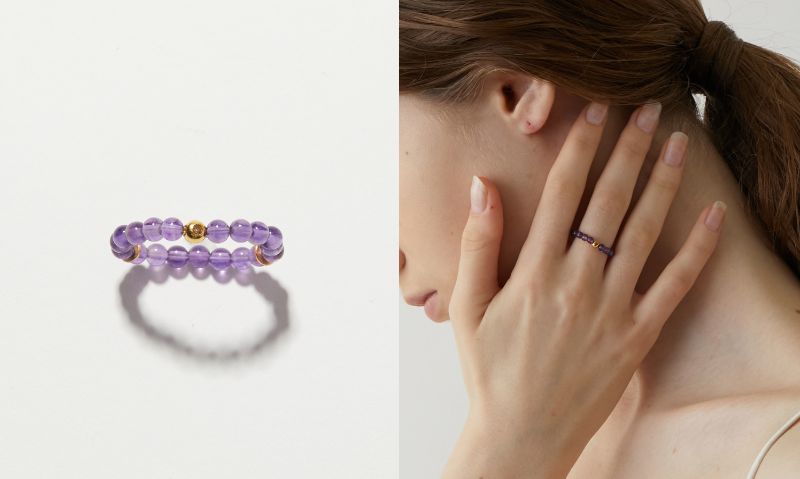 そんなパワーが込められた新作のリングは、個性豊かな球体のストーンの間にモダンなゴールドピーズと一粒ダイヤモンドを配し、繊細な煌めきを添えました。収縮性と強度のあるゴムで繋ぎ、着け心地の良いフリーサイズのリングに仕上げています。