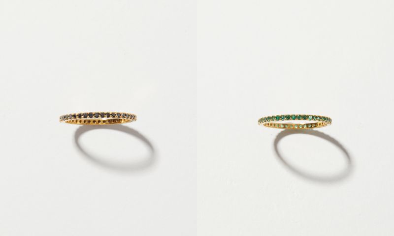 左は漆黒に煌めくブラックダイヤモンド。右は深く濃い、萌葱色の美しいエメラルド。