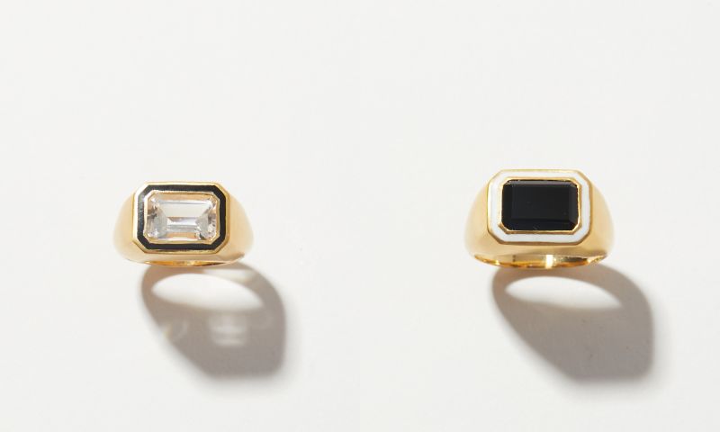 左は、透明度の高いホワイトトパーズに漆黒のエナメルのラインを、右は、オニキスに乳白のエナメルラインをあしらいました。ボリューミーなリングに仕上げ、ひとつでも存在感のあるデザインです。