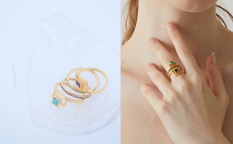 どこかオリエンタルな雰囲気を秘めた、ジオパターンのリングもご用意しました。