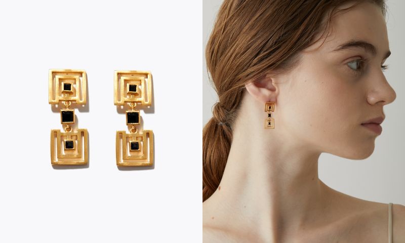 こちらは洗練されたジオメトリックなデザインのピアス。漆黒の艶が美しいオニキスと、ダルポリッシュで仕上げたゴールドが織りなすデザインは、まるで古代の王妃がつけていたかのよう。