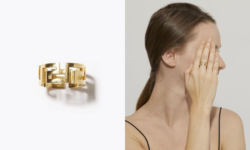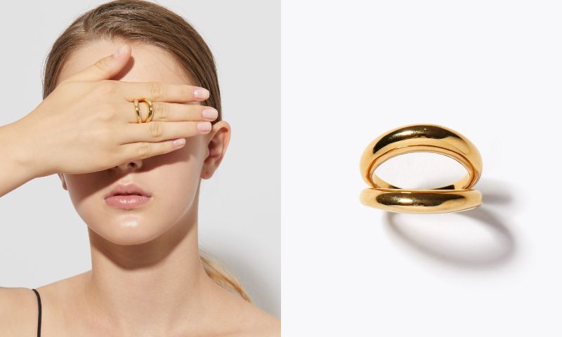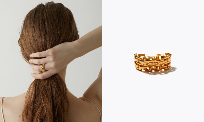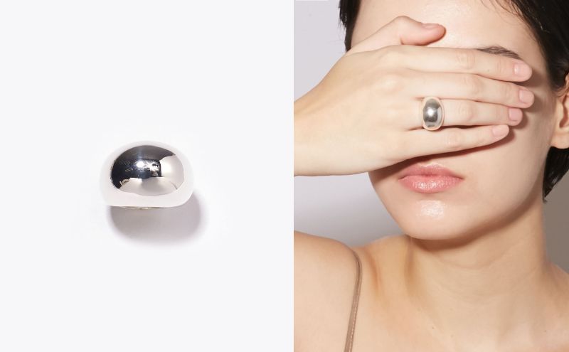 動きと連動して自分からも周りからも目に留まる、指先のジュエリー。ボリュームのあるリングは、一点でも存在感を放ちます。指先をすっきりと、スタイリッシュな印象に。