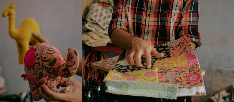 ここで出逢ったのは、色鮮やかなサリーの生地で作られたバッグやおもちゃたち。