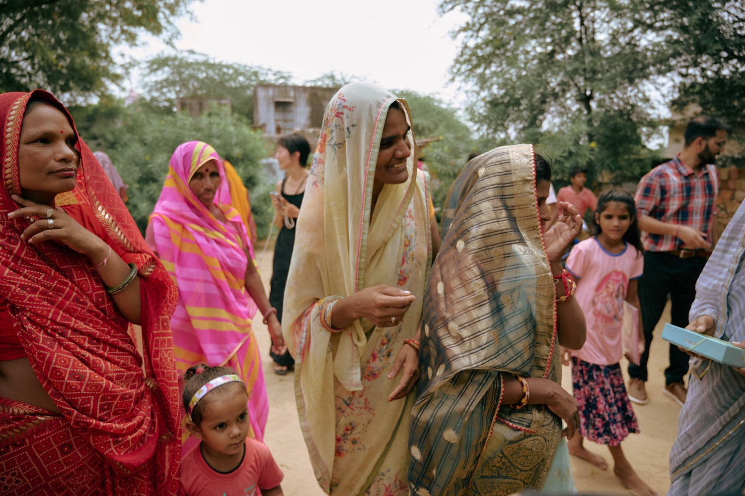 ジャイプール郊外で開催するバザーにて。サリーなどの衣服や食料品を買いに集まる。