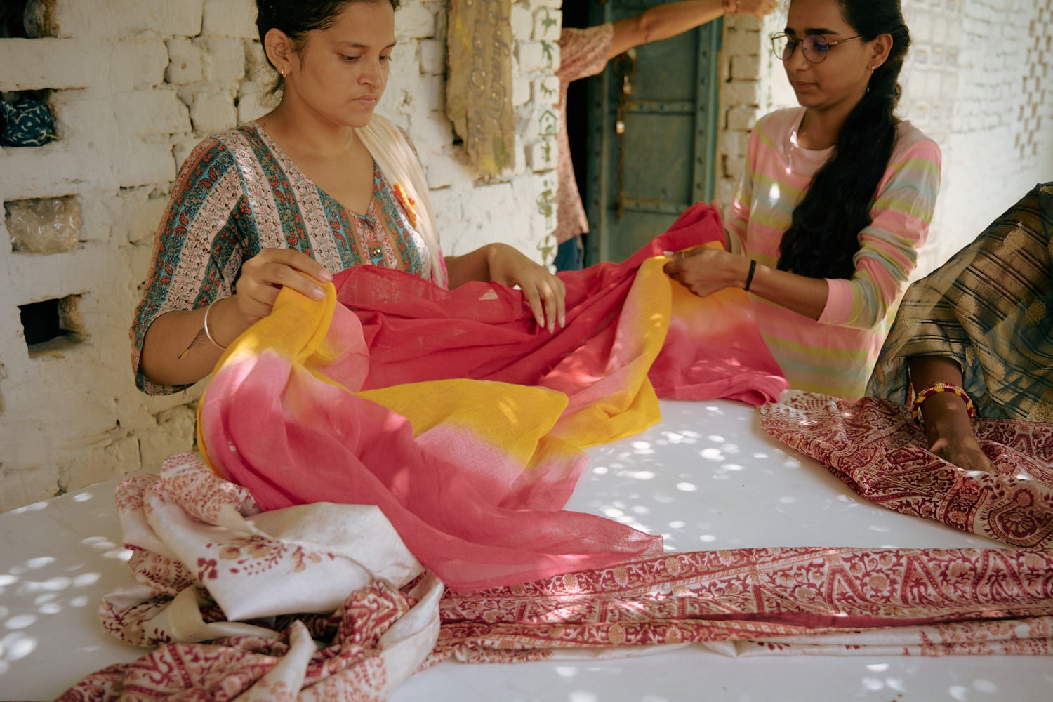 このNGOでは新しい生地を買うのではなく、寄付で集まったサリーをアップサイクルし、女性たちの手で新たな命を吹き込んでいる。