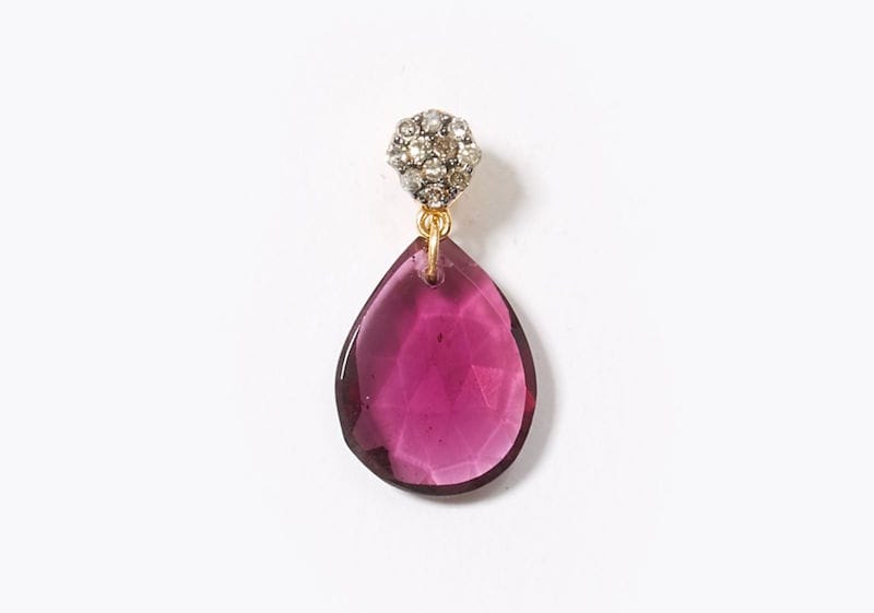 こちらは、艶やかなボルドーのロードライトガーネット、有機的なカットのペアシェイプのストーンを、ダイヤモンドで象った少しいびつなサークルモチーフの下に垂らしました。