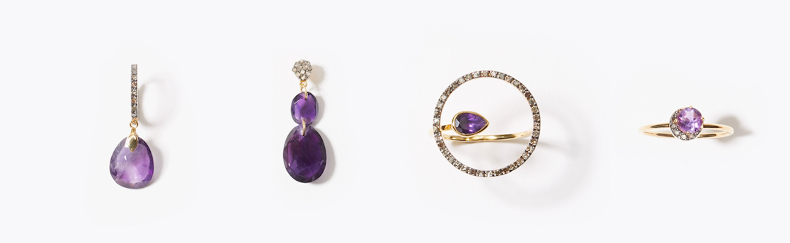 "elafonisi" amethyst pave diamond mini hoop pierced earring 17,280yen (with tax) / "elafonisi" dark amethyst drops and pave disk pierced earring 18,360yen (with tax) / "elafonisi" dark amethyst and pave circle open ring 27,000yen (with tax)
