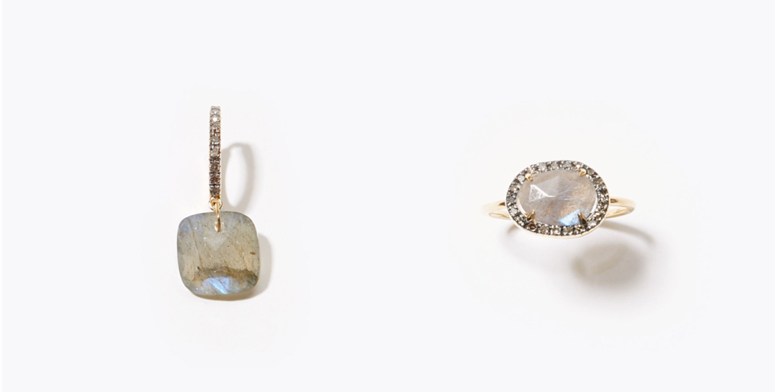 "elafonisi" labradorite pave diamond mini hoop pierced earring 18,360yen (with tax) / "elafonisi" labradorite pave diamond ring 25,920yen (with tax)