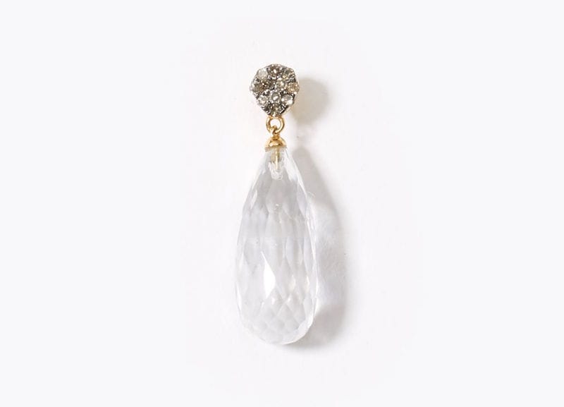 まるで氷柱のような、立体的に煌めくカットのクリスタルクォーツ。ダイヤモンドで象った少しいびつなサークルモチーフの下に垂らしました。