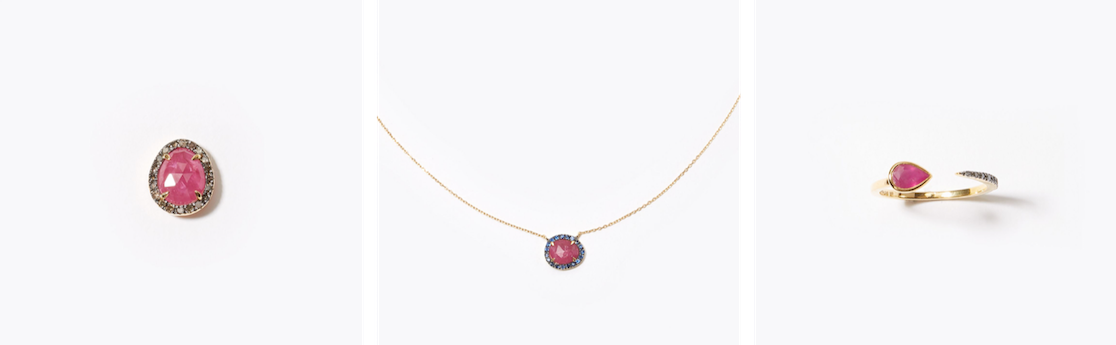 "elafonisi" ruby pave diamond pierced earring 27,000yen (with tax) / "elafonisi" ruby pave sapphire necklace 39,960yen (with tax) / "elafonisi" pear shape ruby pave open ring 18,360yen (with tax) /