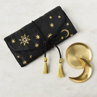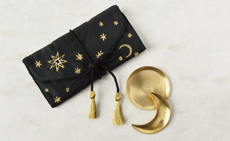 オリエンタルなプリントをほどこしたボックスを開けると、麻素材の生地を貼りこんだジュエリーケースが。