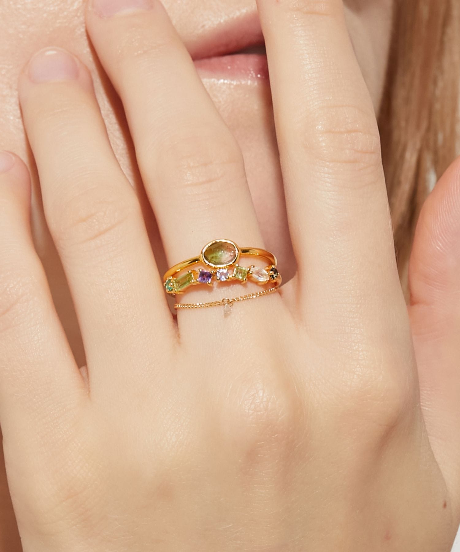 A special set of three limited-edition rings to add color to your holiday season. This ring features a simple bezel-wrapped, precious bicolor tourmaline discovered in Jaipur, India. This half eternity ring features a rhythmic array of multi-stones of different colors and shapes. This 18k gold chain ring features delicate diamonds. Wear them stacked on the same finger, strung together on different fingers, or individually. Enjoy the thrill of discovering your favorite combination. This multi-stone ring will feature one of the listed combinations. This item will be delivered in special packaging. Please note that gift wrapping is not available. We cherish the natural beauty of stones. We value the natural color, shape, size, and inclusions of natural stones, nurtured by the chance of time, as beautiful and unique features. Please note that this item cannot be resized. Thank you for your understanding.