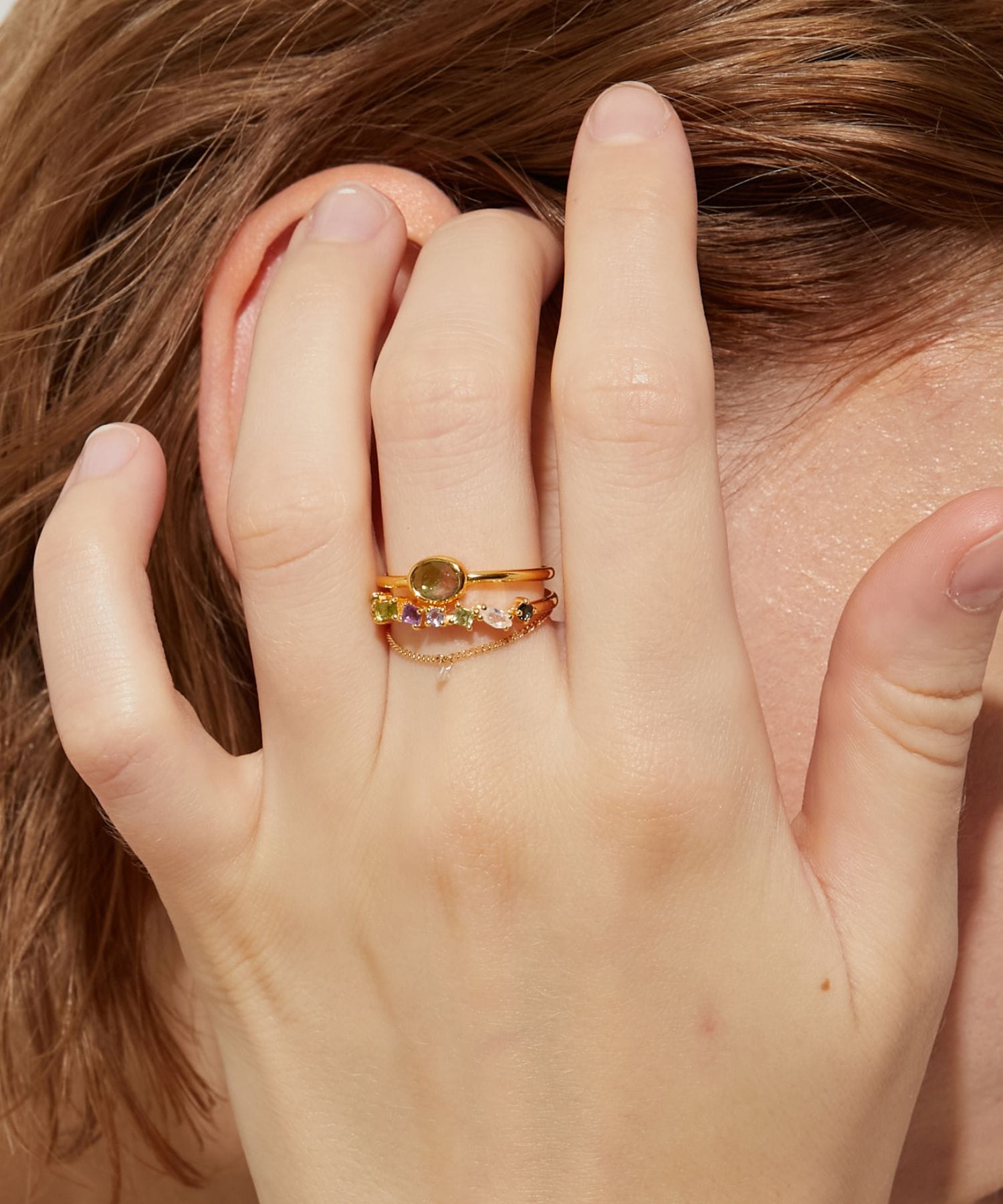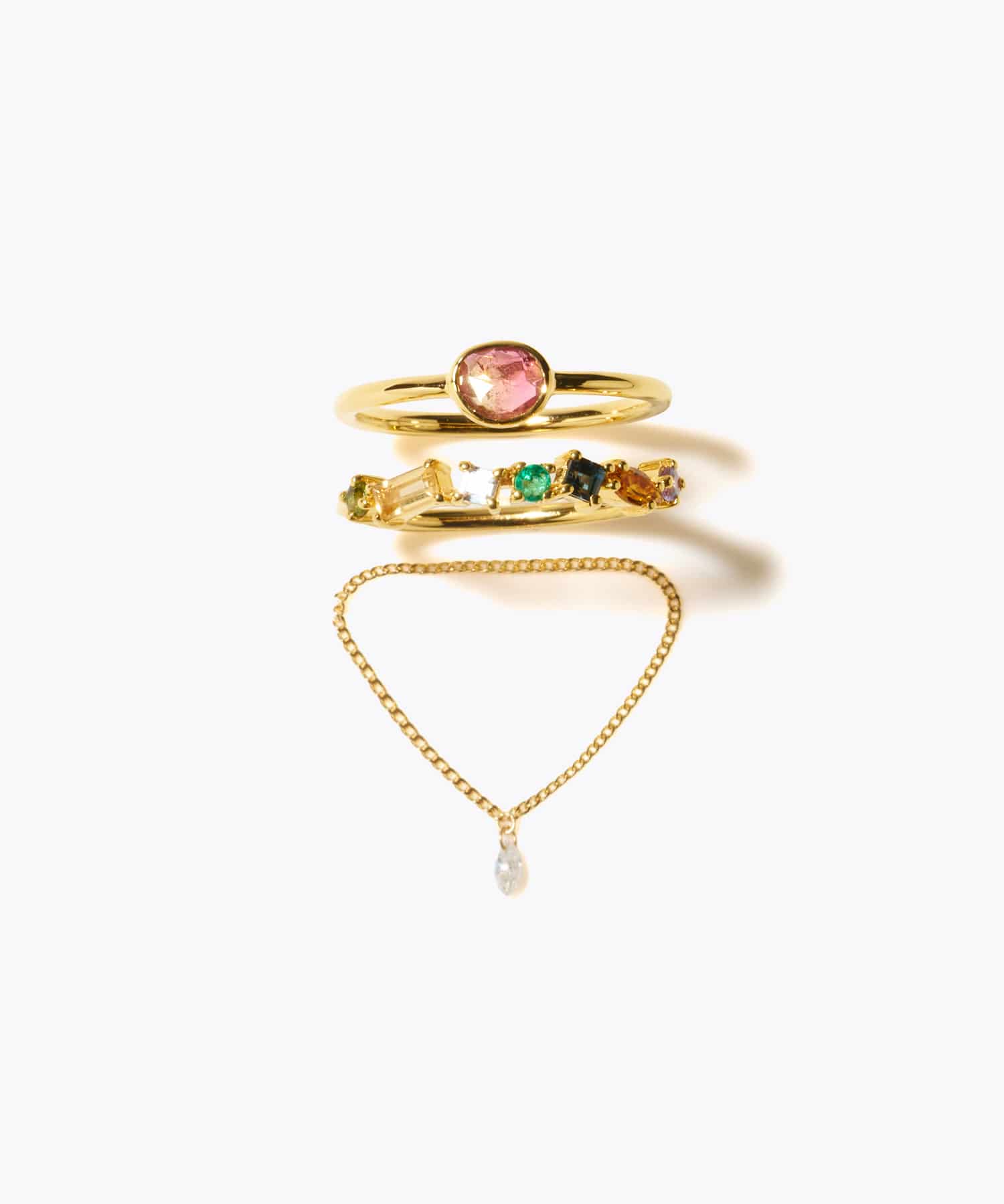 A special set of three limited-edition rings to add color to your holiday season. This ring features a simple bezel-wrapped, precious bicolor tourmaline discovered in Jaipur, India. This half eternity ring features a rhythmic array of multi-stones of different colors and shapes. This 18k gold chain ring features delicate diamonds. Wear them stacked on the same finger, strung together on different fingers, or individually. Enjoy the thrill of discovering your favorite combination. This multi-stone ring will feature one of the listed combinations. This item will be delivered in special packaging. Please note that gift wrapping is not available. We cherish the natural beauty of stones. We value the natural color, shape, size, and inclusions of natural stones, nurtured by the chance of time, as beautiful and unique features. Please note that this item cannot be resized. Thank you for your understanding.