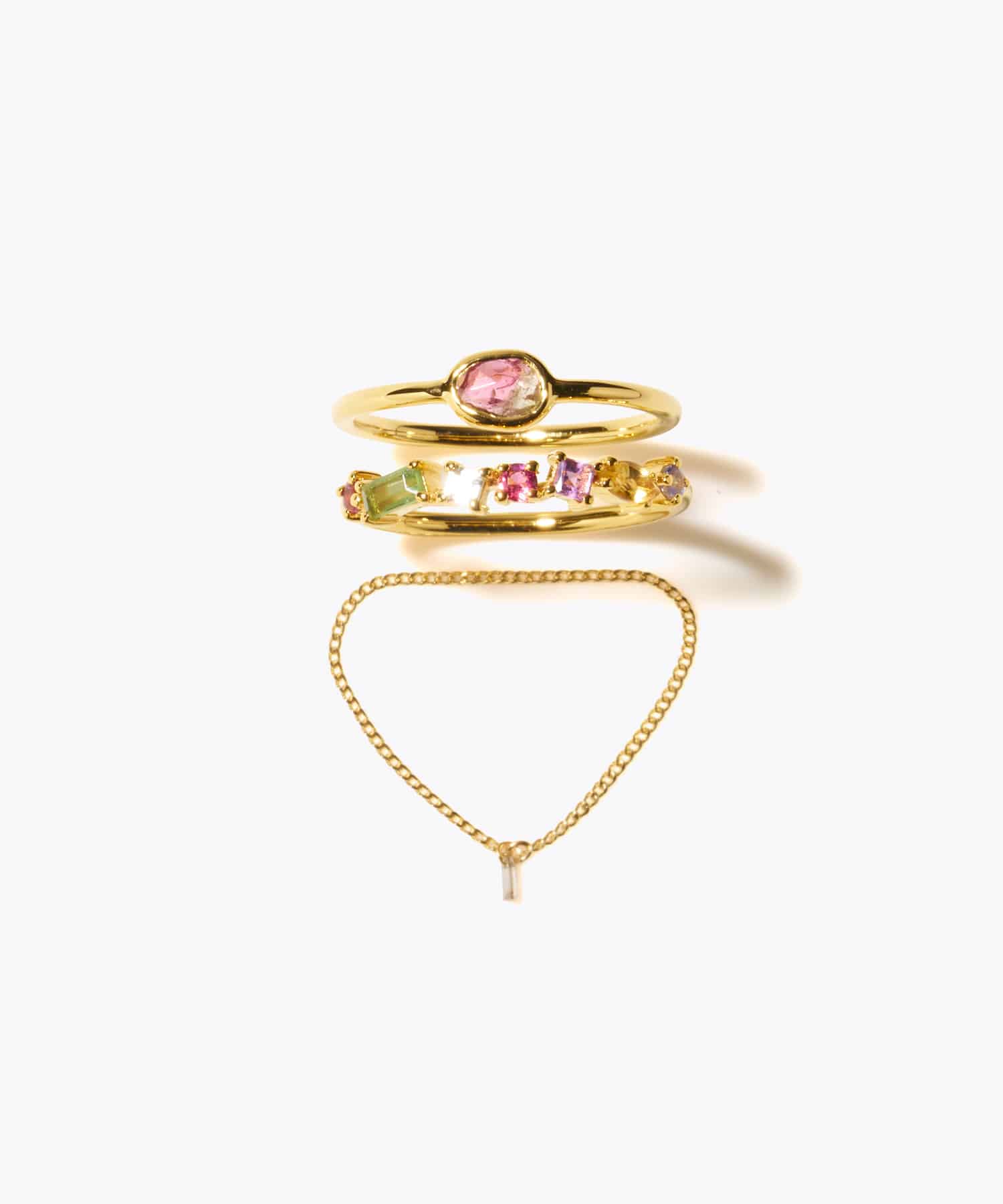 A special set of three limited-edition rings to add color to your holiday season. This ring features a simple bezel-wrapped, precious bicolor tourmaline discovered in Jaipur, India. This half eternity ring features a rhythmic array of multi-stones of different colors and shapes. This 18k gold chain ring features delicate diamonds. Wear them stacked on the same finger, strung together on different fingers, or individually. Enjoy the thrill of discovering your favorite combination. This multi-stone ring will feature one of the listed combinations. This item will be delivered in special packaging. Please note that gift wrapping is not available. We cherish the natural beauty of stones. We value the natural color, shape, size, and inclusions of natural stones, nurtured by the chance of time, as beautiful and unique features. Please note that this item cannot be resized. Thank you for your understanding.
