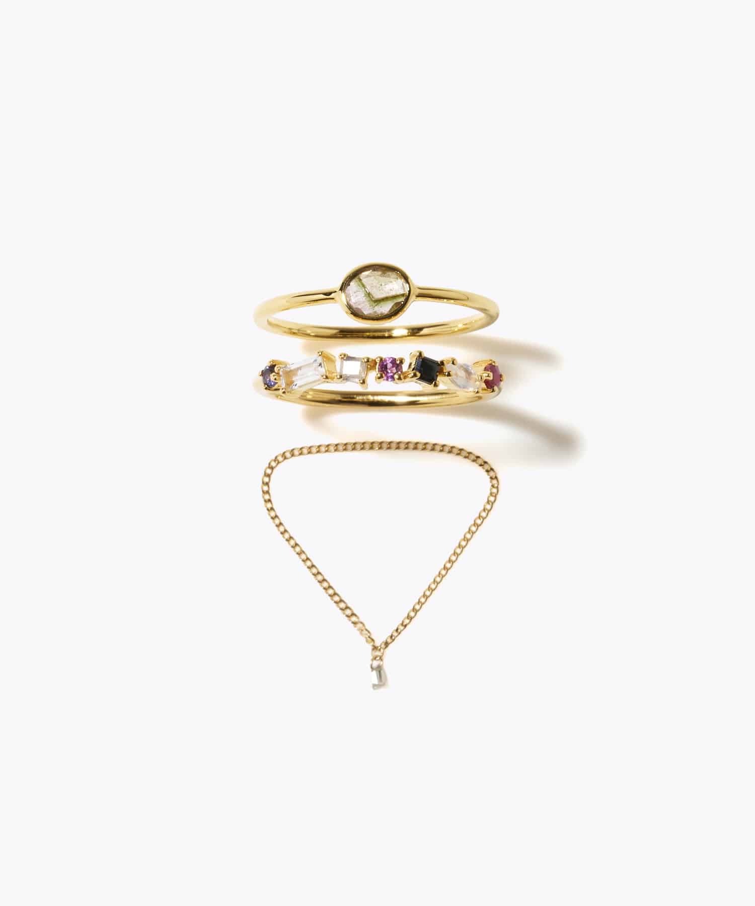 A special set of three limited-edition rings to add color to your holiday season. This ring features a simple bezel-wrapped, precious bicolor tourmaline discovered in Jaipur, India. This half eternity ring features a rhythmic array of multi-stones of different colors and shapes. This 18k gold chain ring features delicate diamonds. Wear them stacked on the same finger, strung together on different fingers, or individually. Enjoy the thrill of discovering your favorite combination. This multi-stone ring will feature one of the listed combinations. This item will be delivered in special packaging. Please note that gift wrapping is not available. We cherish the natural beauty of stones. We value the natural color, shape, size, and inclusions of natural stones, nurtured by the chance of time, as beautiful and unique features. Please note that this item cannot be resized. Thank you for your understanding.