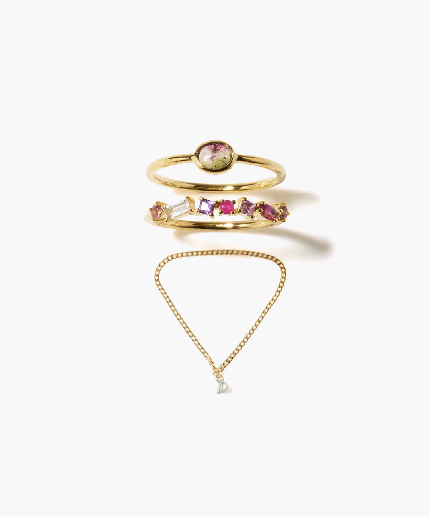 A special set of three limited-edition rings to add color to your holiday season. This ring features a simple bezel-wrapped, precious bicolor tourmaline discovered in Jaipur, India. This half eternity ring features a rhythmic array of multi-stones of different colors and shapes. This 18k gold chain ring features delicate diamonds. Wear them stacked on the same finger, strung together on different fingers, or individually. Enjoy the thrill of discovering your favorite combination. This multi-stone ring will feature one of the listed combinations. This item will be delivered in special packaging. Please note that gift wrapping is not available. We cherish the natural beauty of stones. We value the natural color, shape, size, and inclusions of natural stones, nurtured by the chance of time, as beautiful and unique features. Please note that this item cannot be resized. Thank you for your understanding.