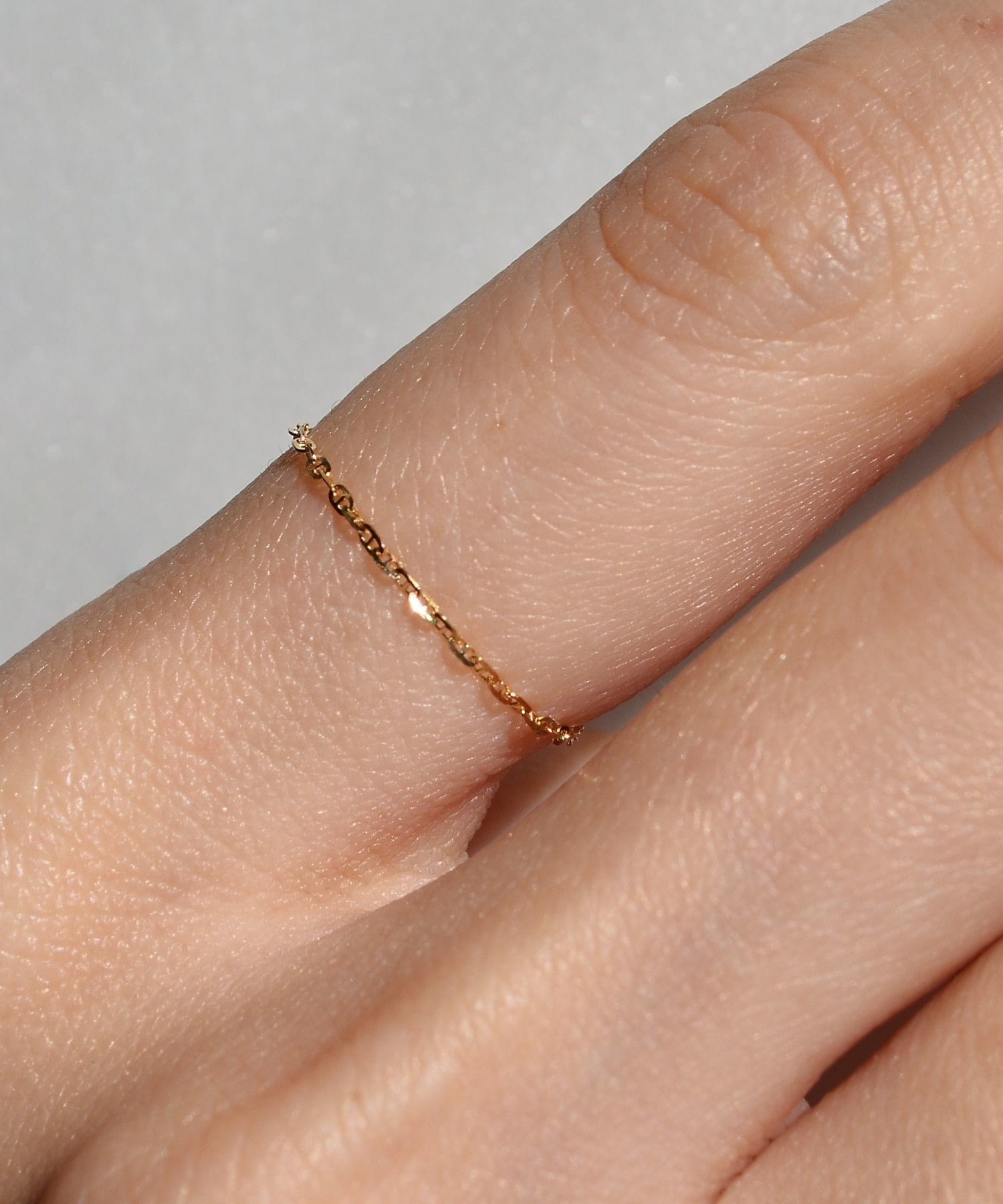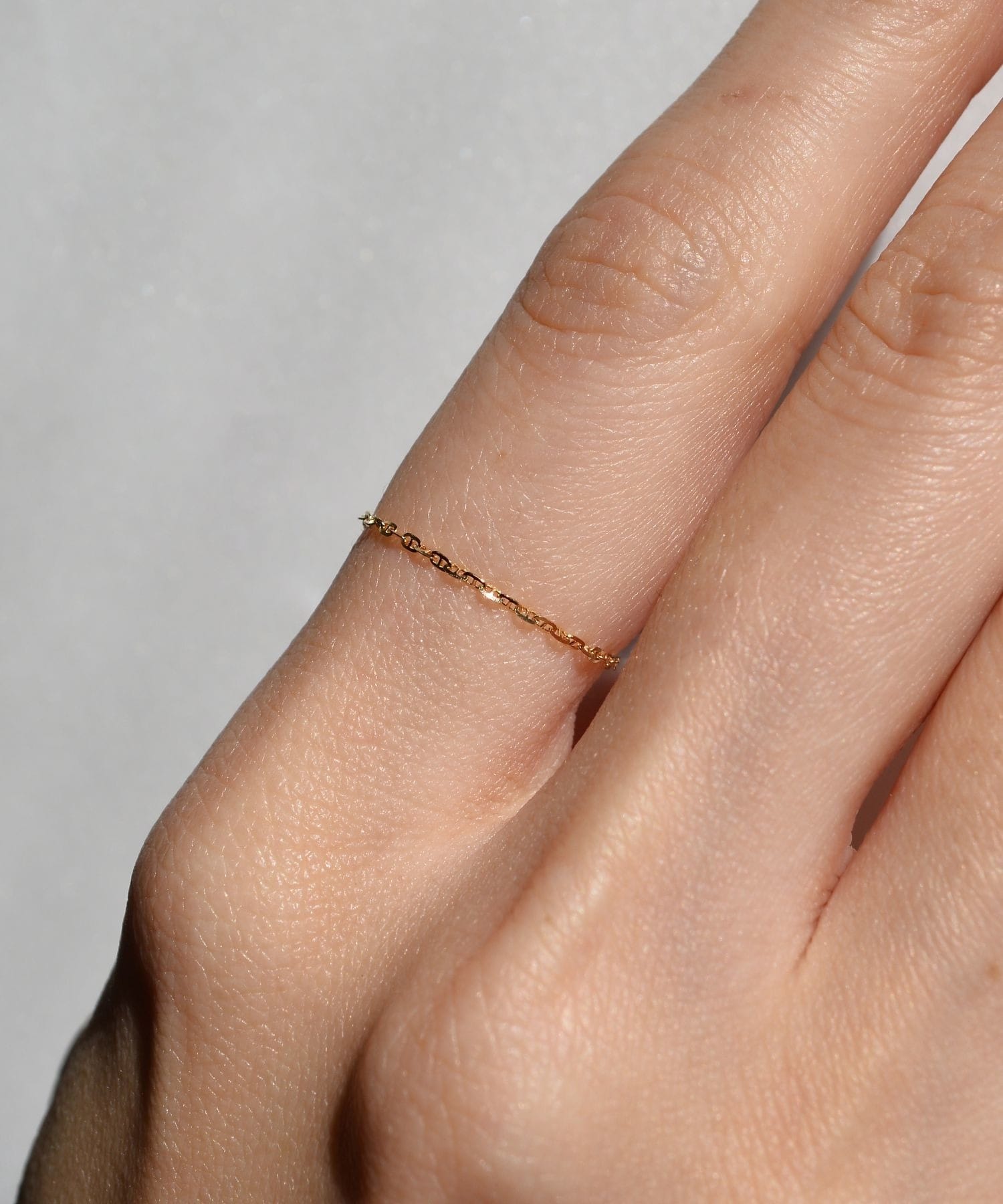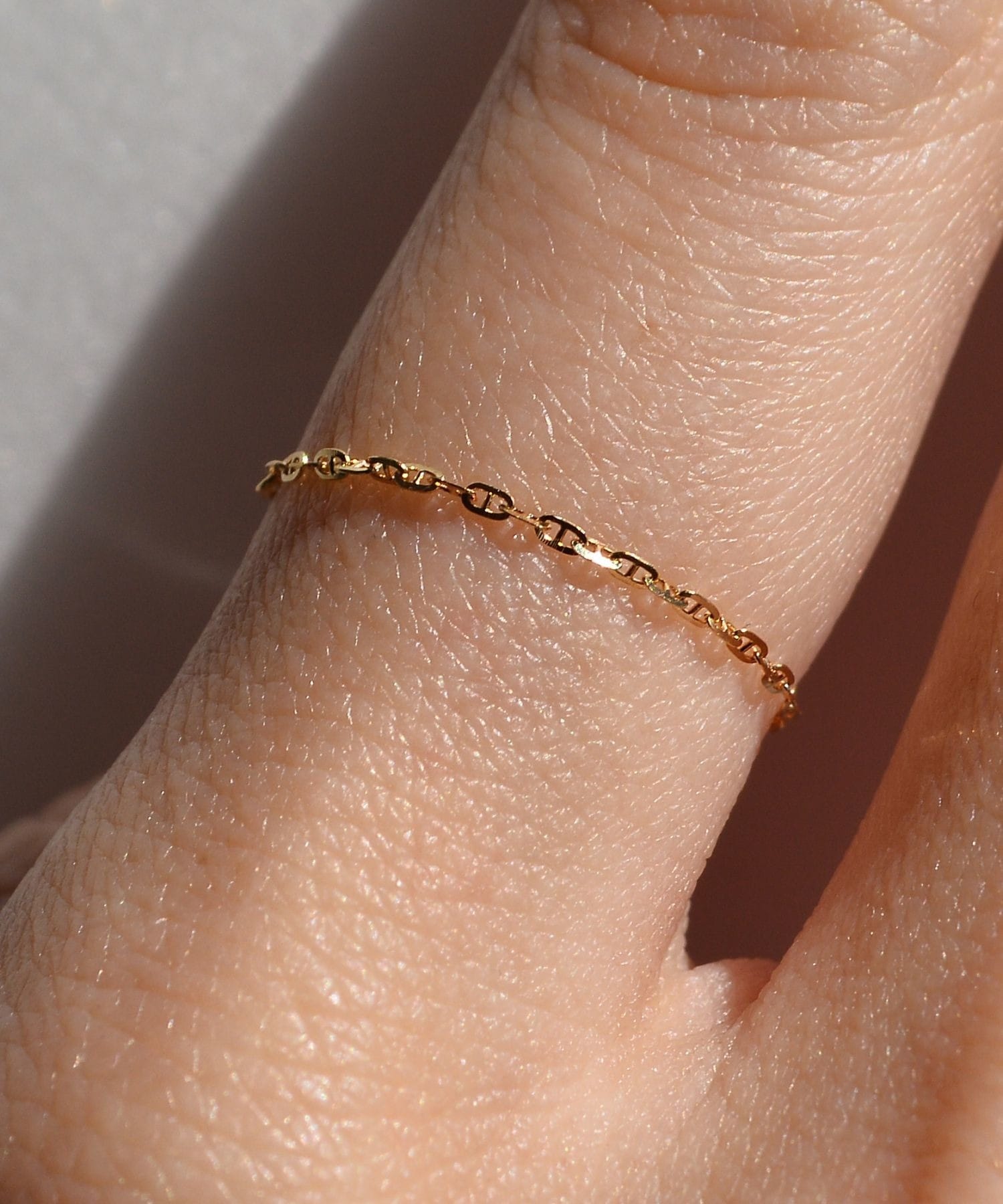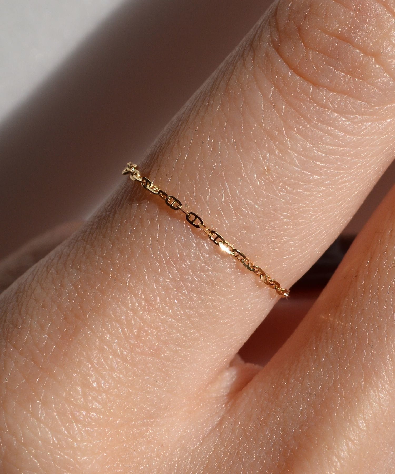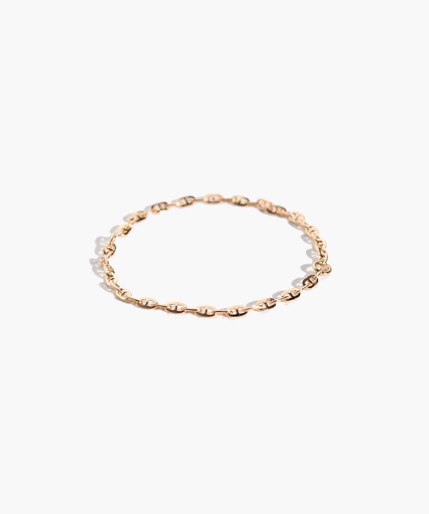 This chain ring is crafted from delicately shimmering 18k gold. The chain, inspired by the anchors that anchor ships to port, sparkles with its cut edges, adding a touch of glamour to your wrist. Layering it with other chain rings or simple rings adds a modern touch.