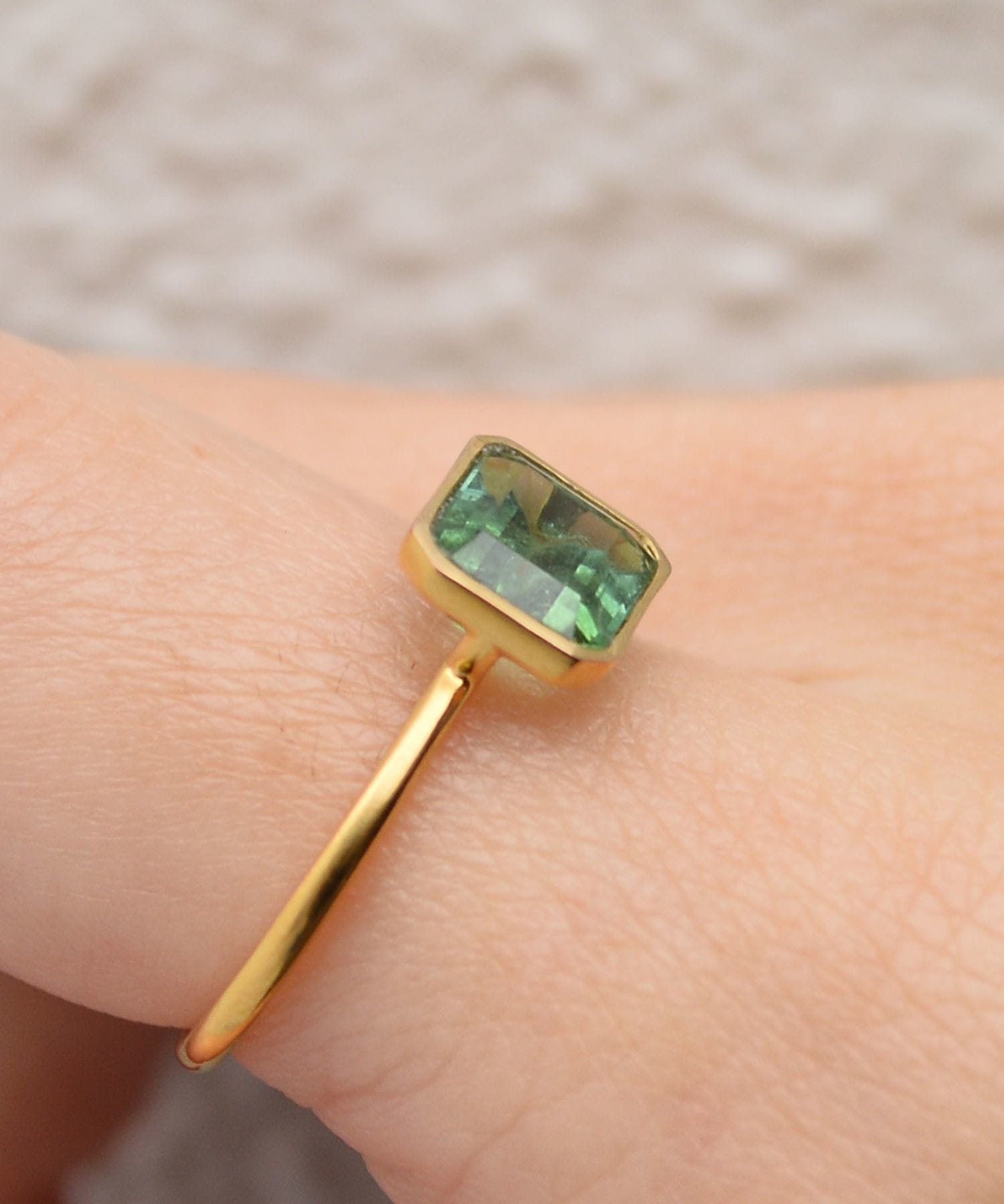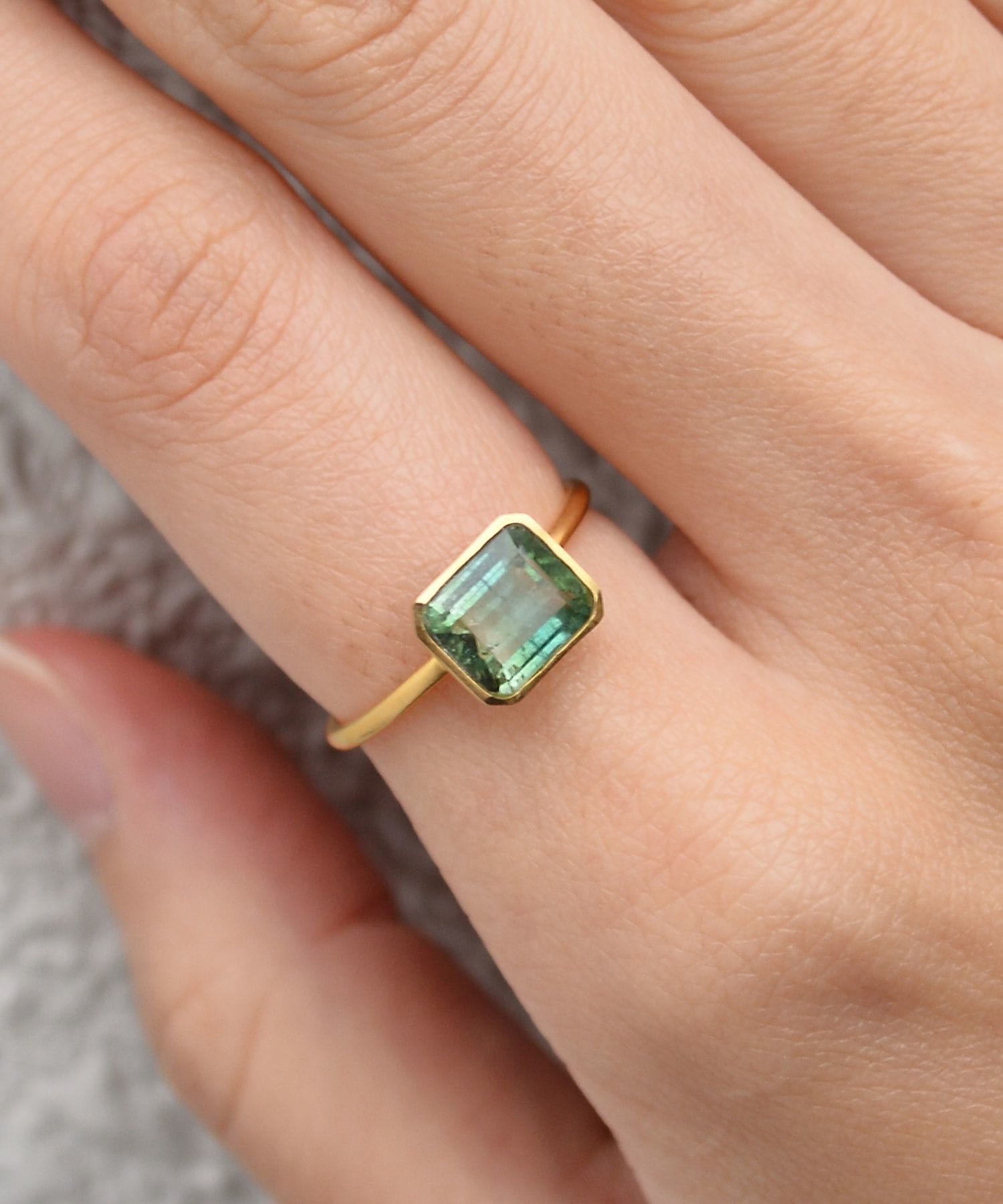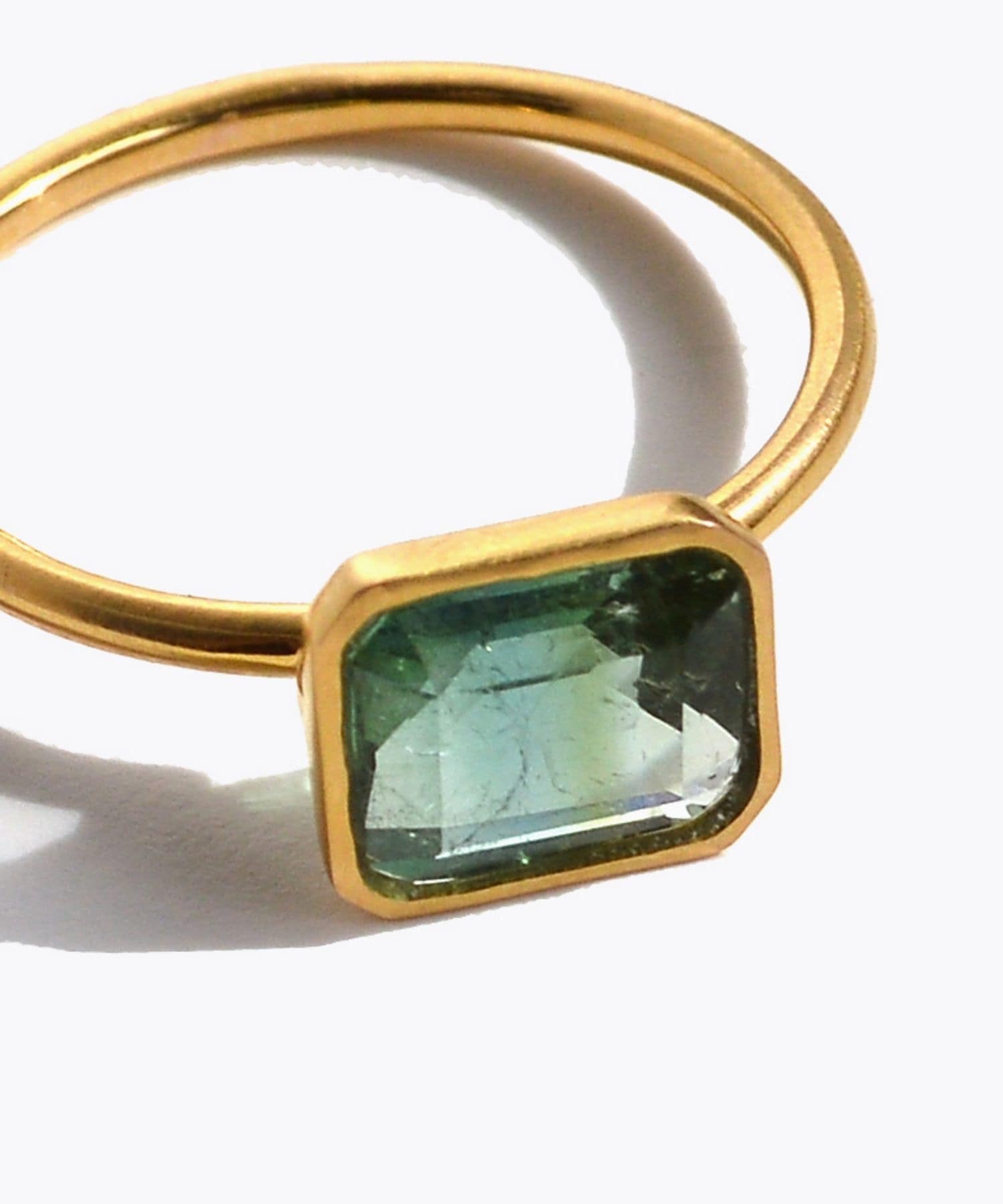 Tourmaline is said to possess every color, but this rare, one-of-a-kind ring displays a beautiful gradation of only light and dark shades of green. Stones that exhibit multiple colors are known as "party colors," but this stone is composed solely of green, a quiet miracle born from nature.