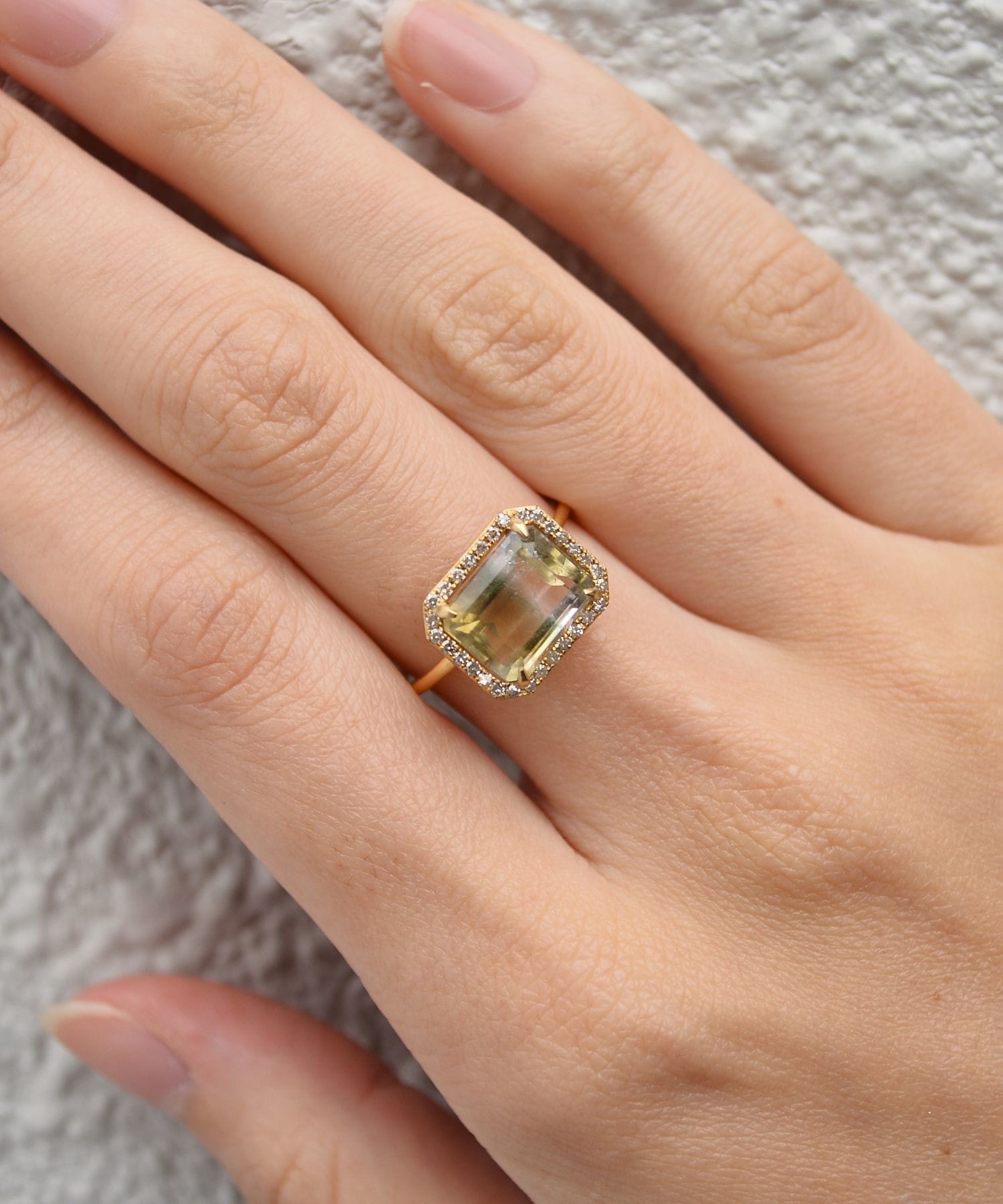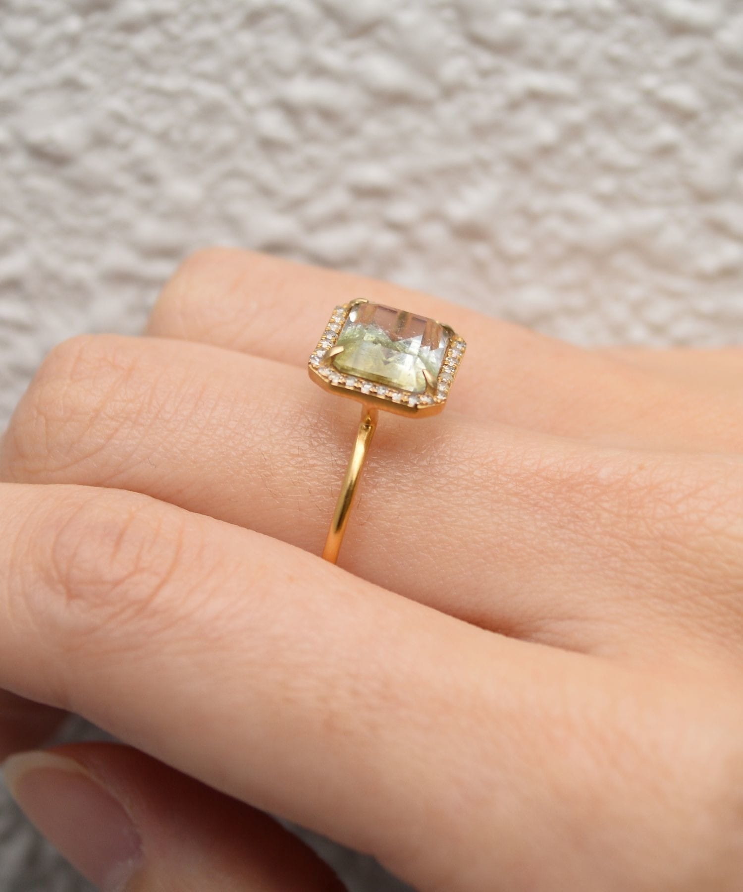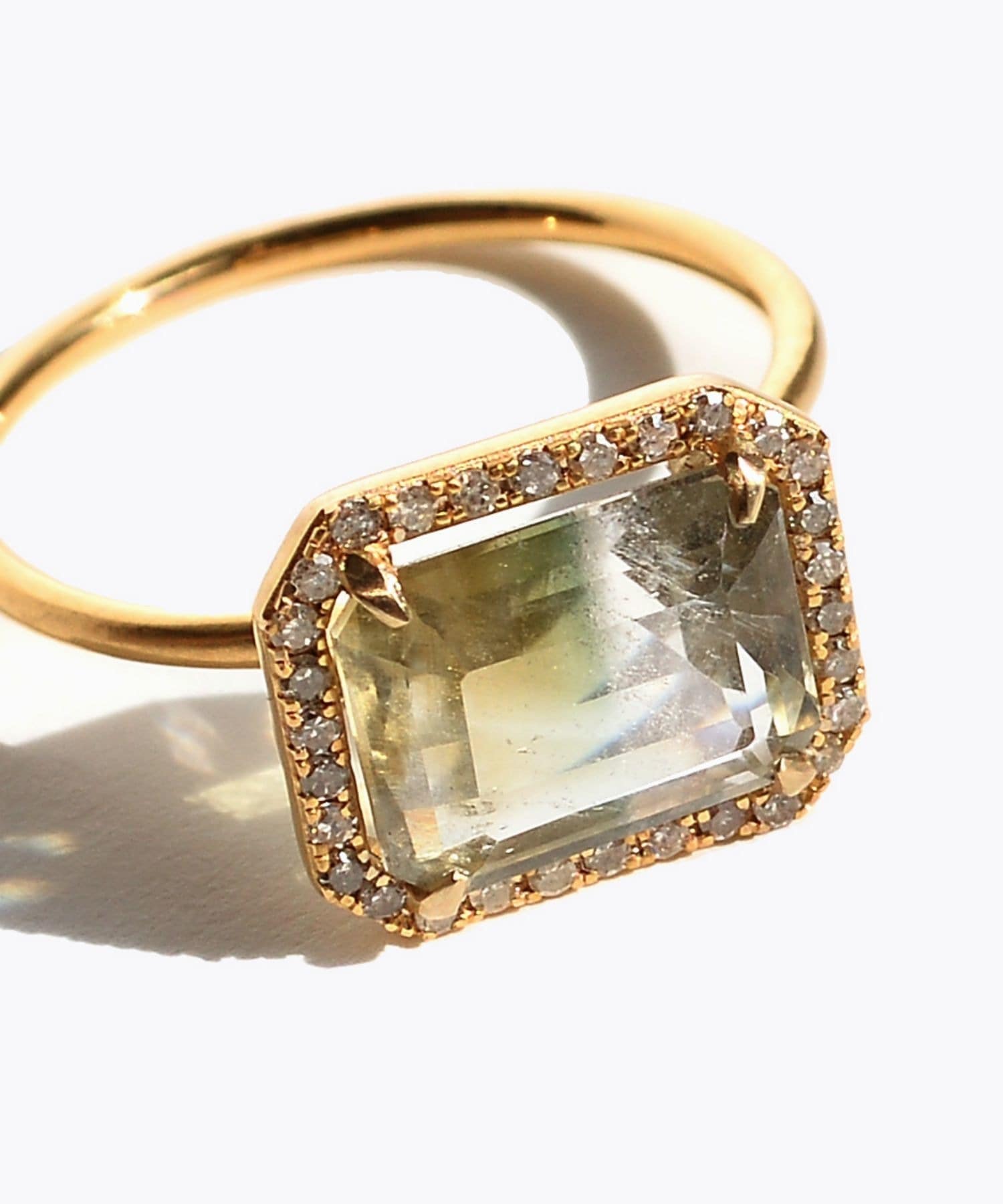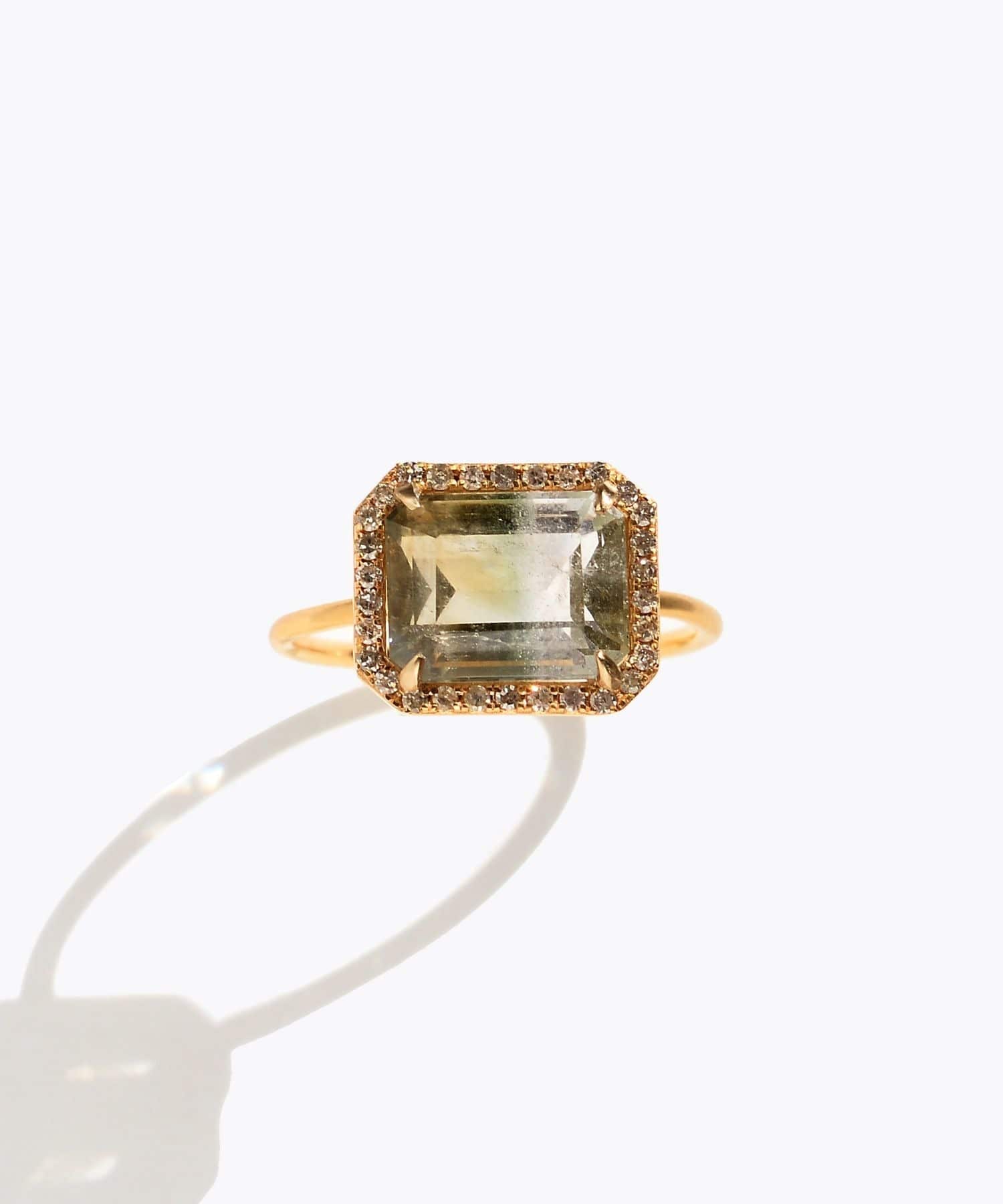 This one-of-a-kind ring features a chic two-tone quartz stone luxuriously surrounded by pav? diamonds. The khaki-tinged nuanced color is rare for a transparent stone, making it an appealing stone that also pairs well with fashion. Along with its clear transparency, the delicate pav? diamonds surrounding it give it an elegant sparkle. A one-of-a-kind piece that adds a sophisticated accent to any outfit.