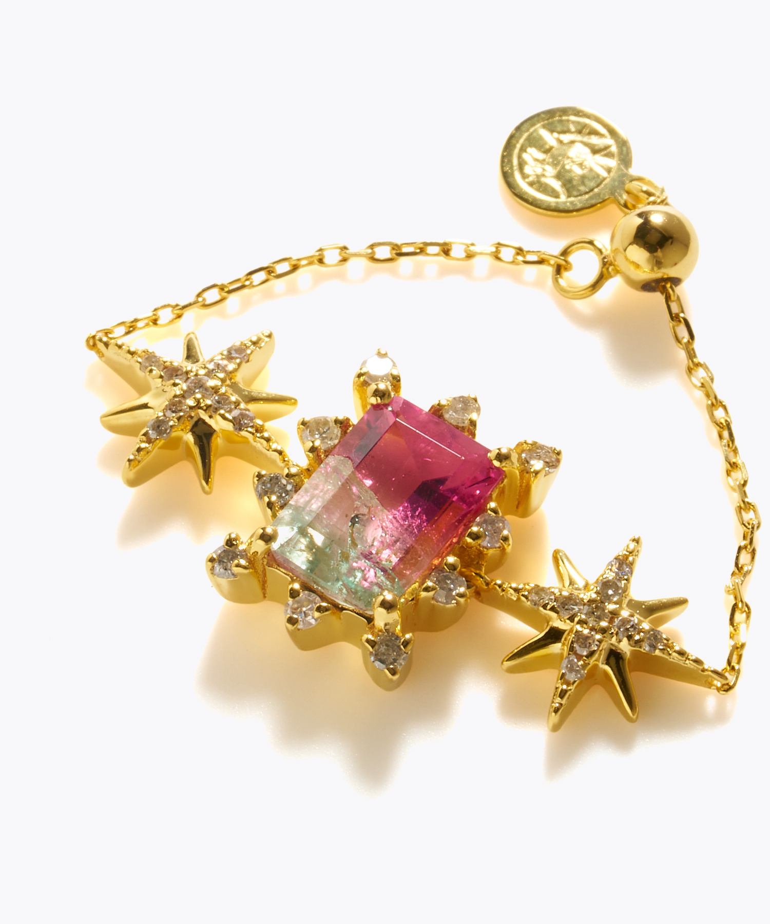Featuring a vibrant two-tone tourmaline as the centerpiece, this chain ring adds a playful touch with star motifs, perfect for the holiday season.