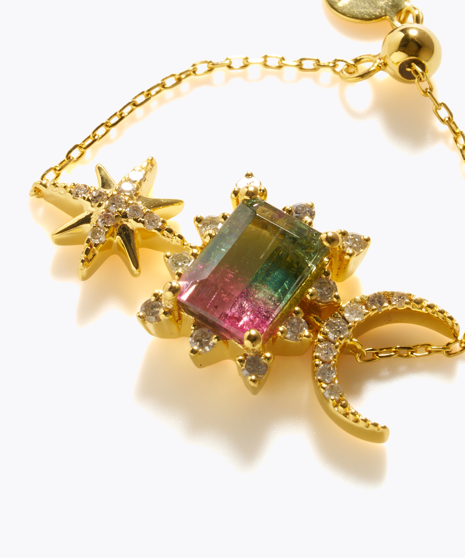 Featuring a vibrant two-tone tourmaline as the centerpiece, this chain ring adds a playful touch with a moon and star motif, perfect for the holiday season.