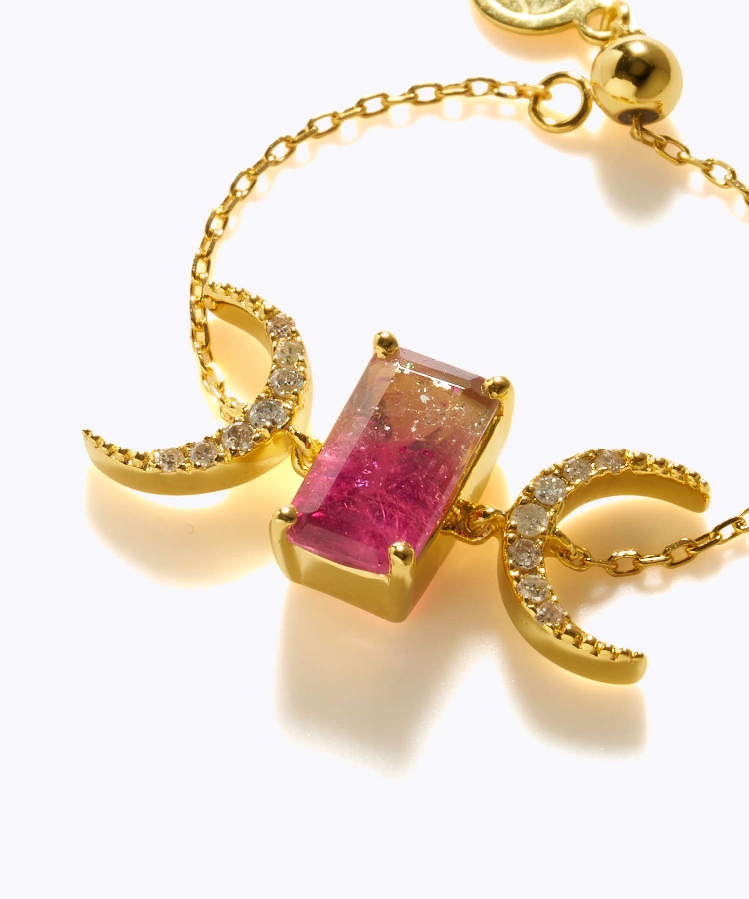 Featuring a vibrant two-tone tourmaline as the centerpiece, with a playful moon motif, this chain ring will add color to the holiday season.