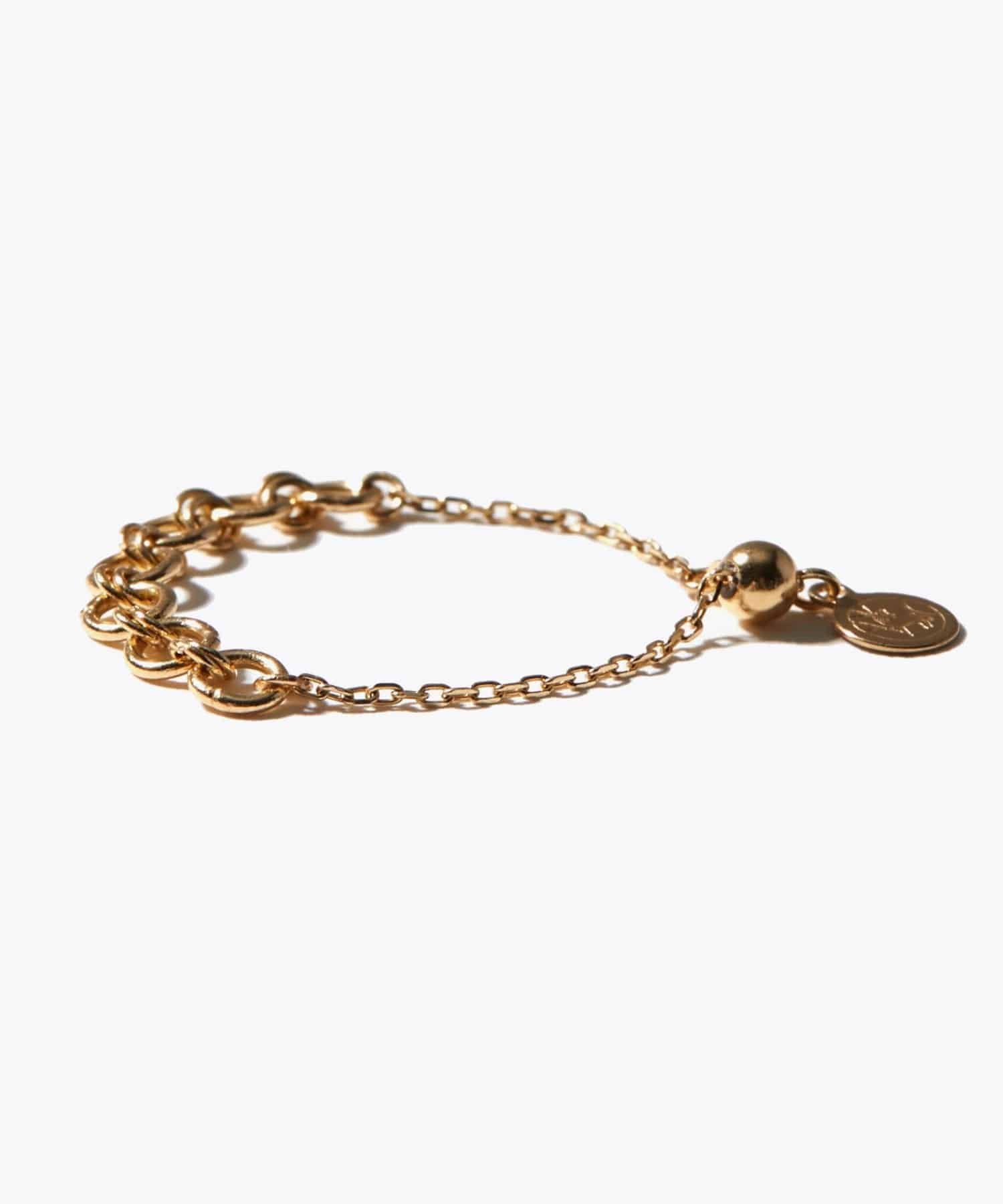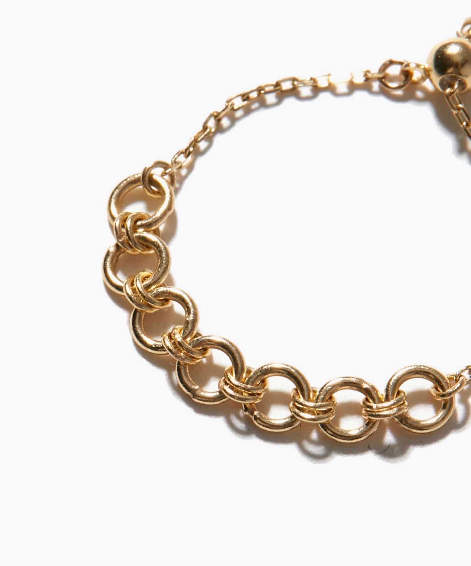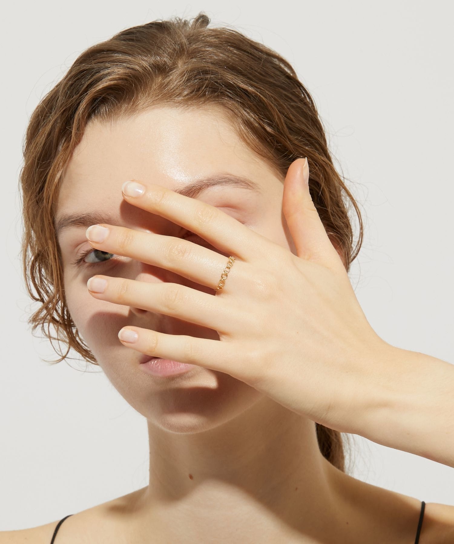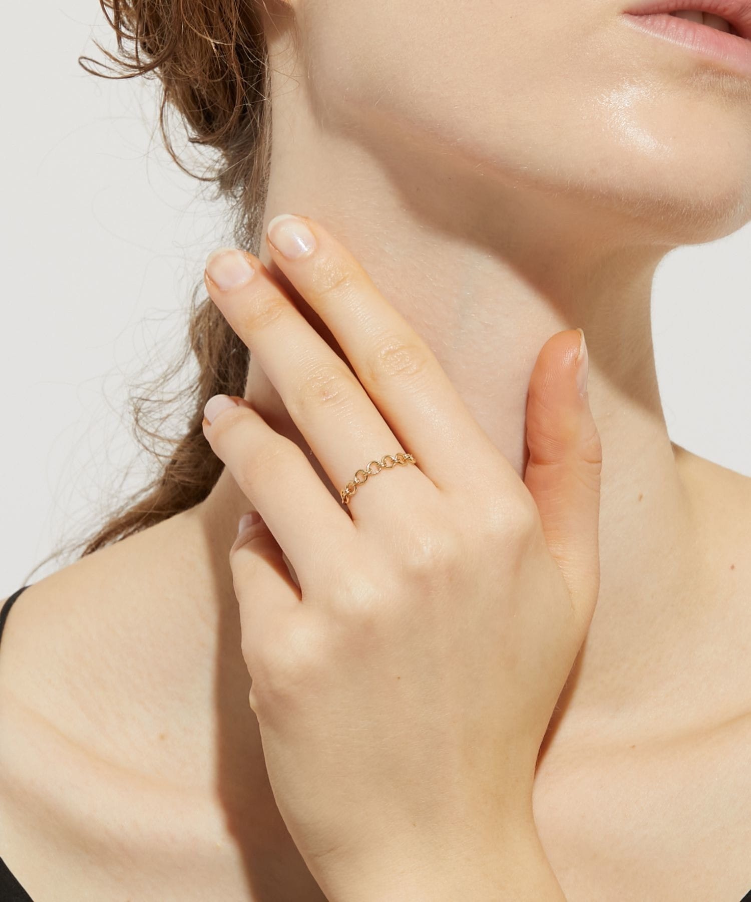 This chain ring features linked rings crafted from 10K gold, emitting a lustrous sparkle. The sliding mechanism allows for size adjustment up to approximately size 18. This allows you to freely change the finger to suit your mood and outfit, expanding the possibilities for layering with other rings. It adds a touch of light elegance to your fingertips, allowing you to enjoy a variety of outfits.