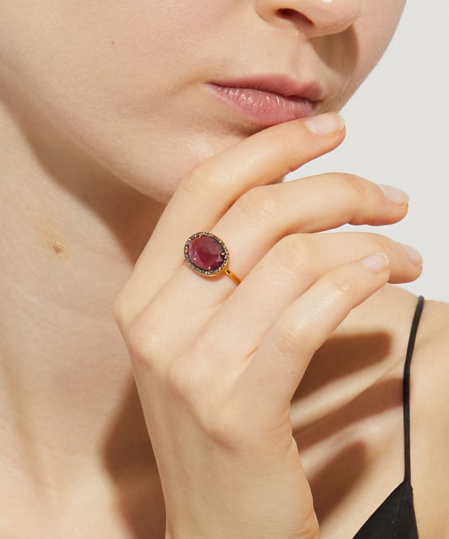 Purple-burgundy rhodolite garnet. The rose-cut gemstone in an attractive organic shape is surrounded by beautifully shining melee diamonds.
