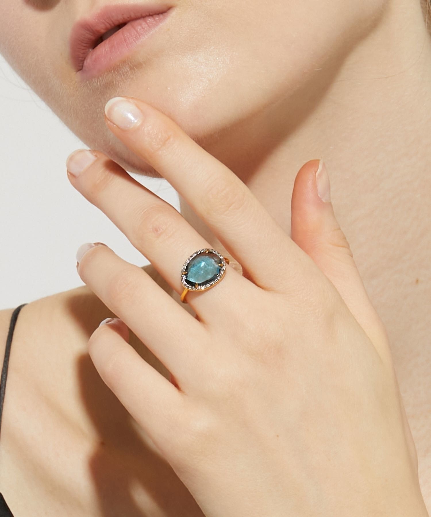Deep color of a London blue topaz leaves you a pleasant impression reminding you of the dimly lit night sky. The rose-cut gemstone in an attractive organic shape is surrounded by beautifully shining melee diamonds.