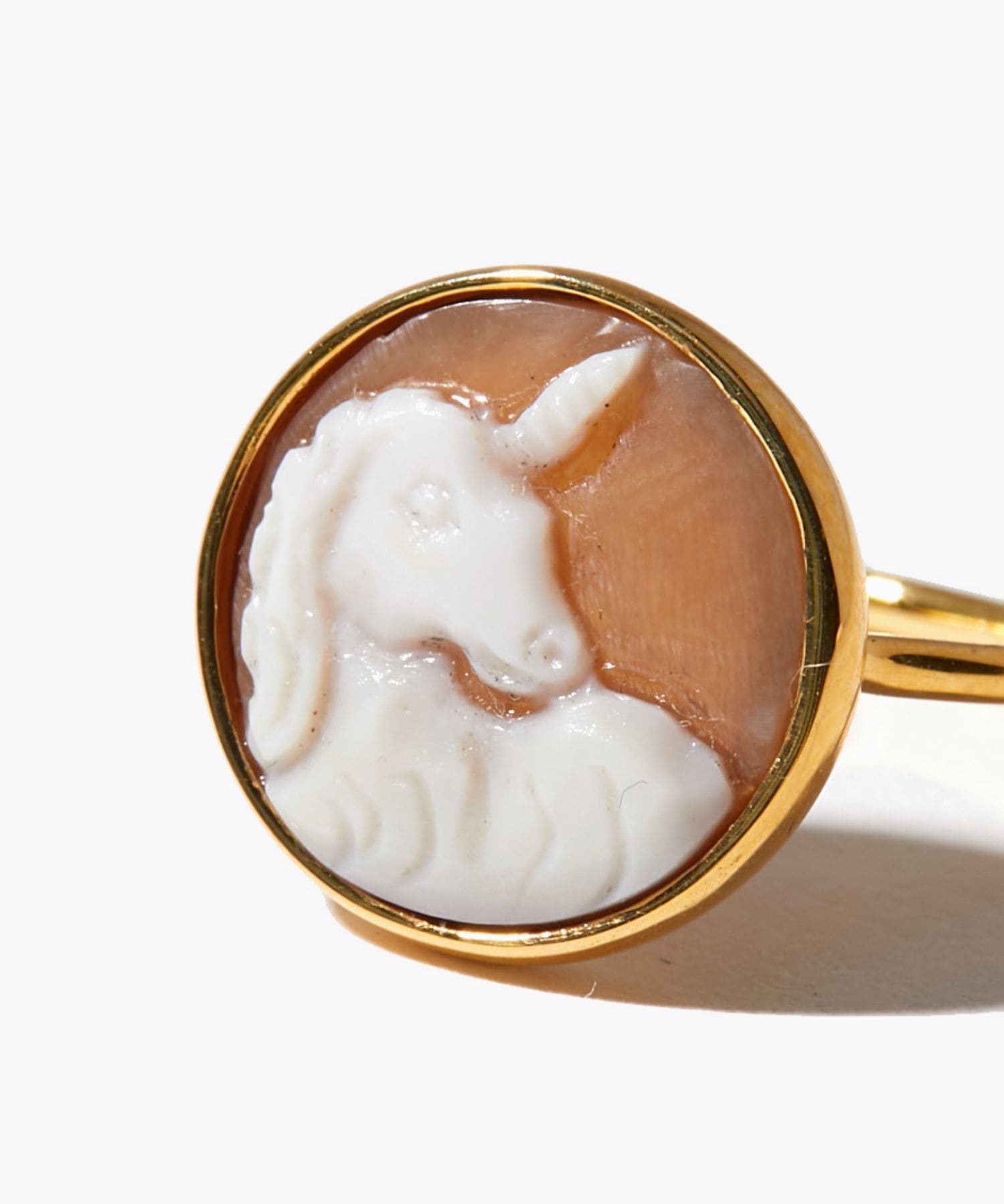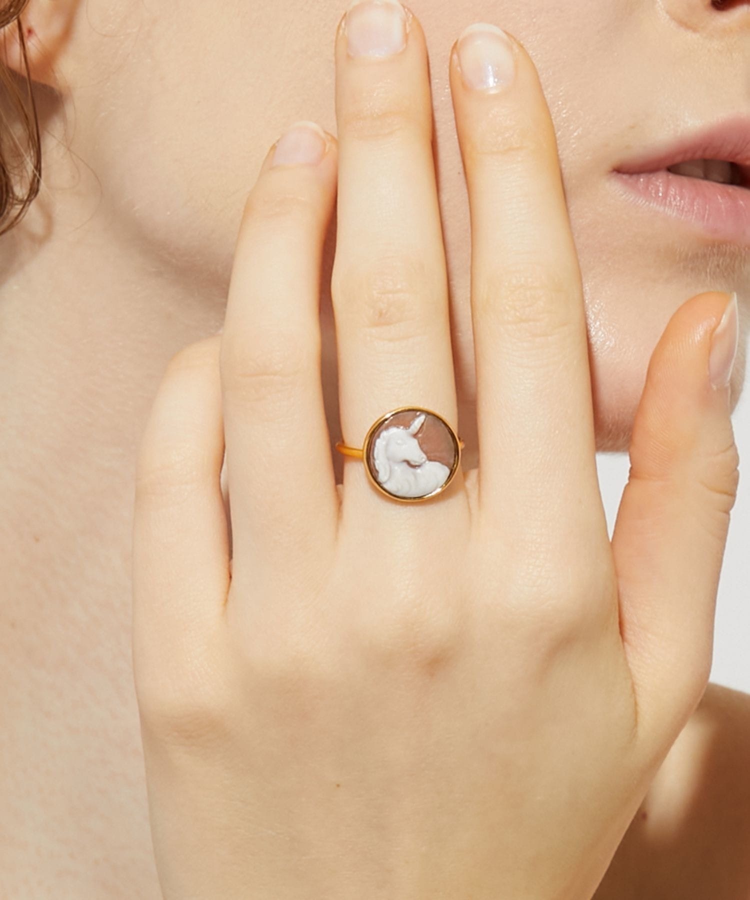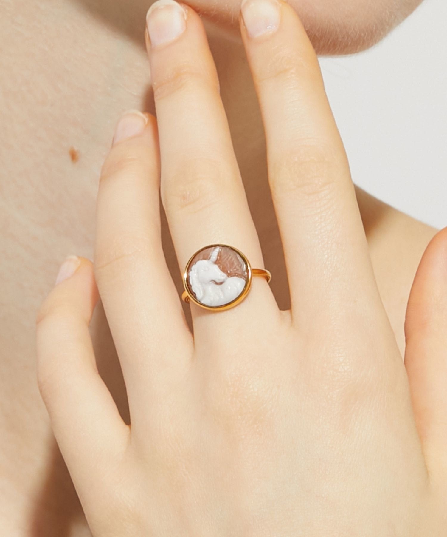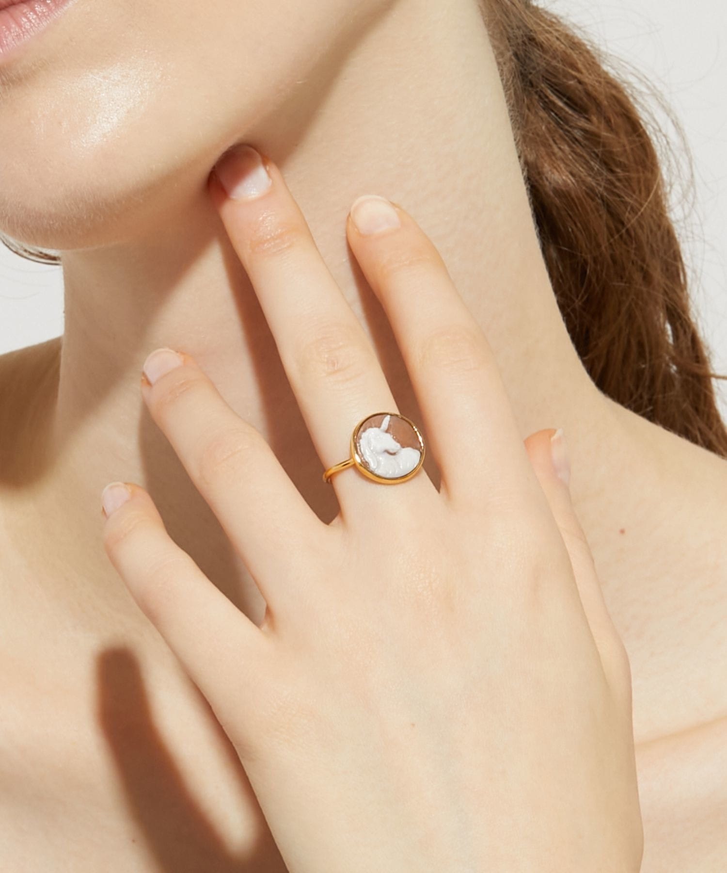 This charming, plump, and three-dimensional shell cameo evokes the warmth of handcrafted artistry. Each piece is meticulously hand-carved in Naples, Italy?a world-renowned center for shell carving. The horse motif symbolizes “success,” “advancement,” and “financial fortune,” representing an auspicious emblem believed since ancient times to “bring victory.” We've reimagined it with a unicorn design, known for “making dreams come true.” Wear it like a talisman. Its chic brown color pairs easily with any outfit, making it a ring you'll enjoy wearing every day. *Please note: As the cameo uses natural shell material, each piece varies slightly in color and shape. Additionally, since the carving is done by hand by artisans, the design may also show slight individual differences. Each piece is unique.