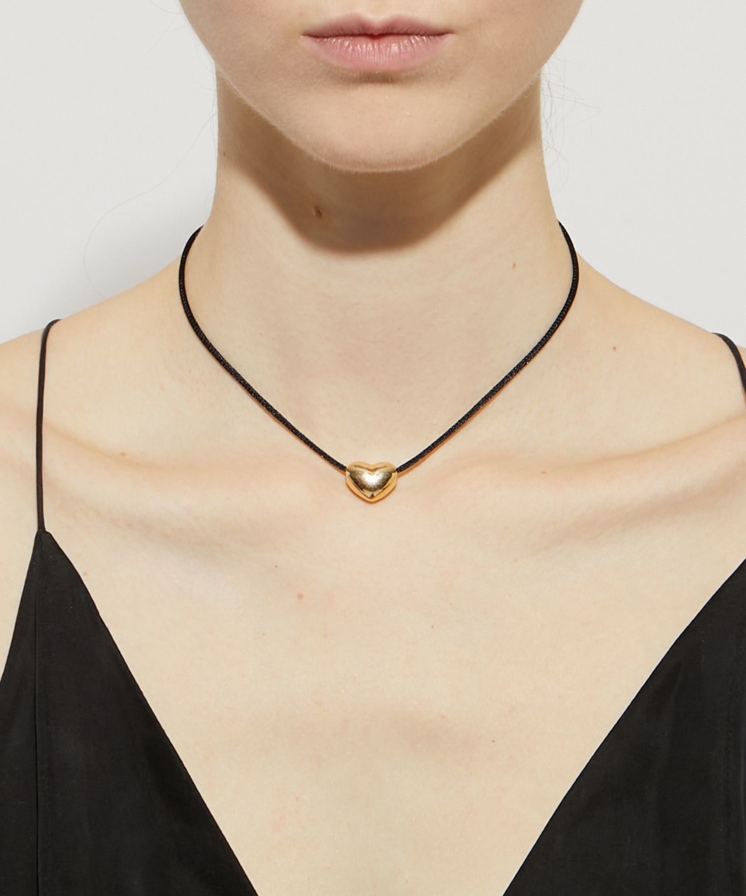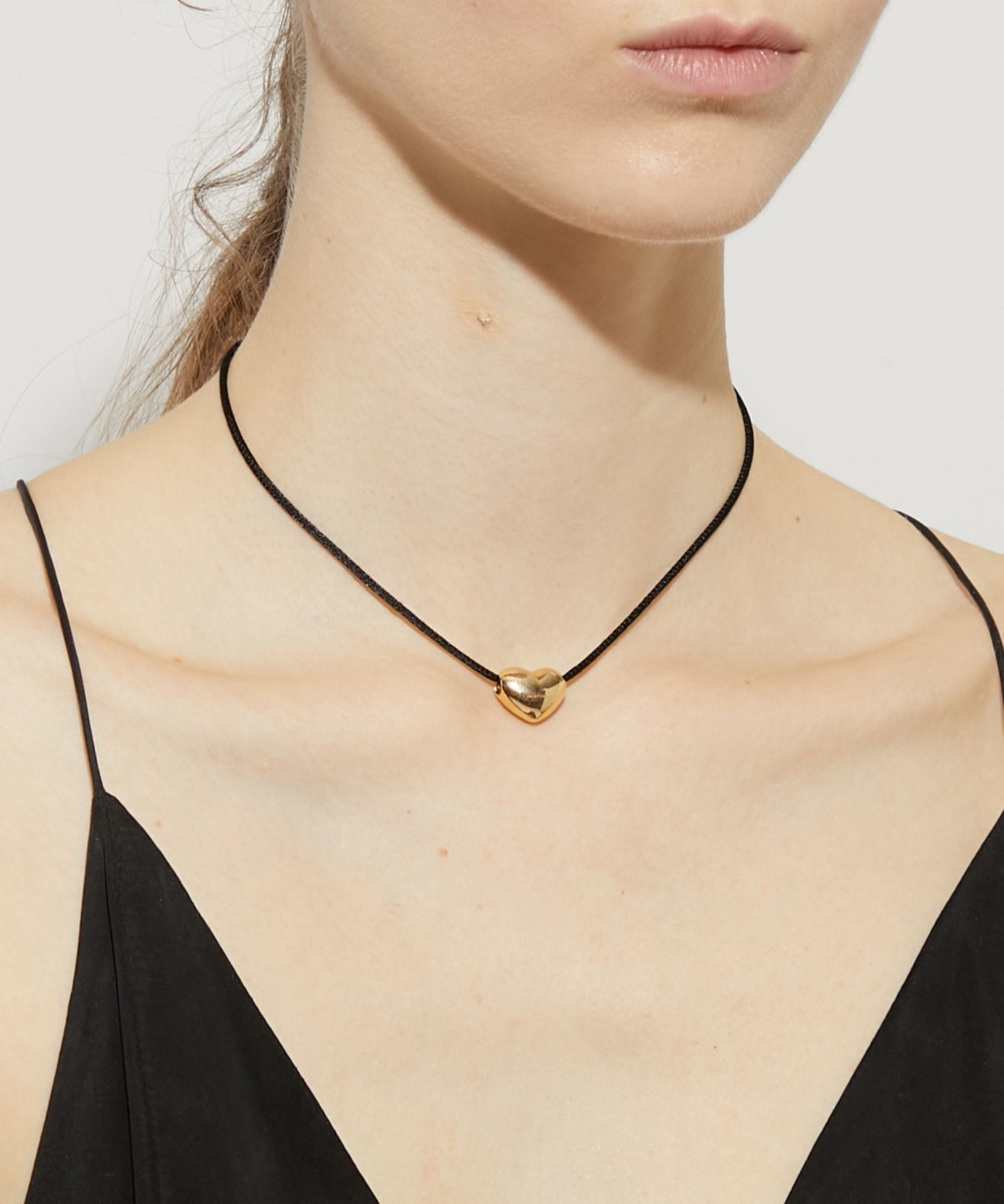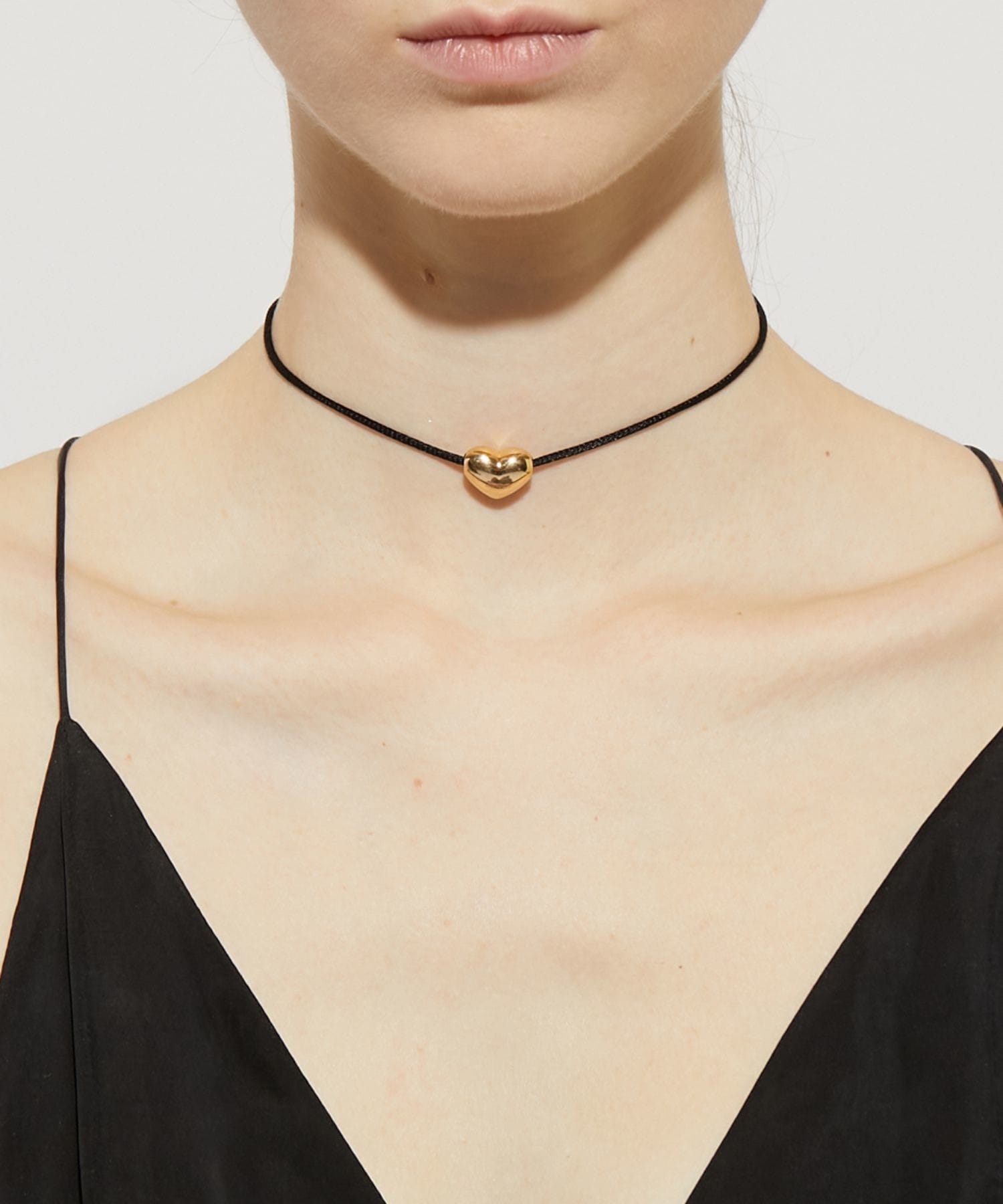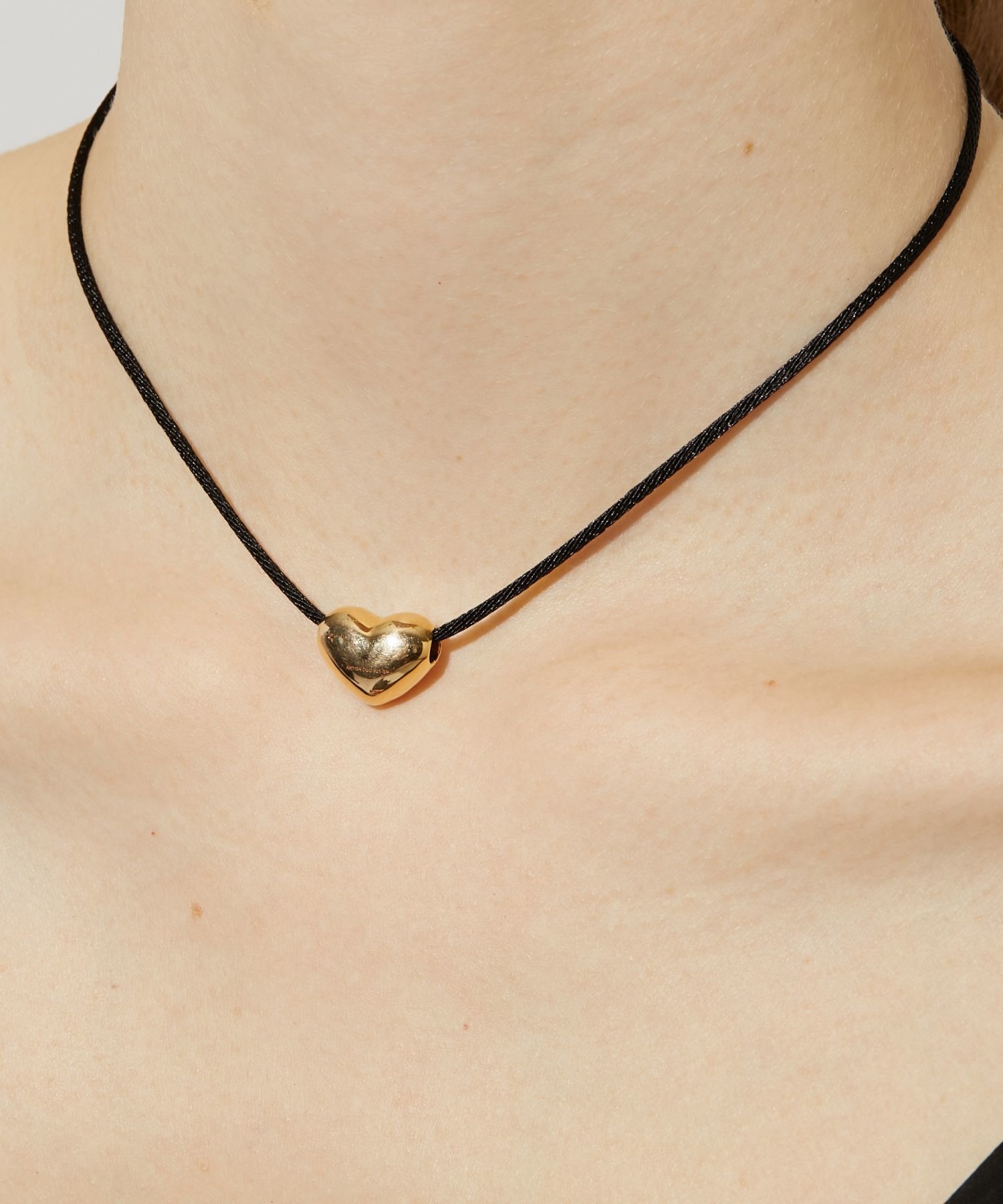 This choker features a plump gold heart that glitters softly in the light. The minimalist black cord enhances its brilliance, adding a modern touch. The length can be adjusted by changing the position of the clasp, so you can enjoy freely arranging it to suit your style.