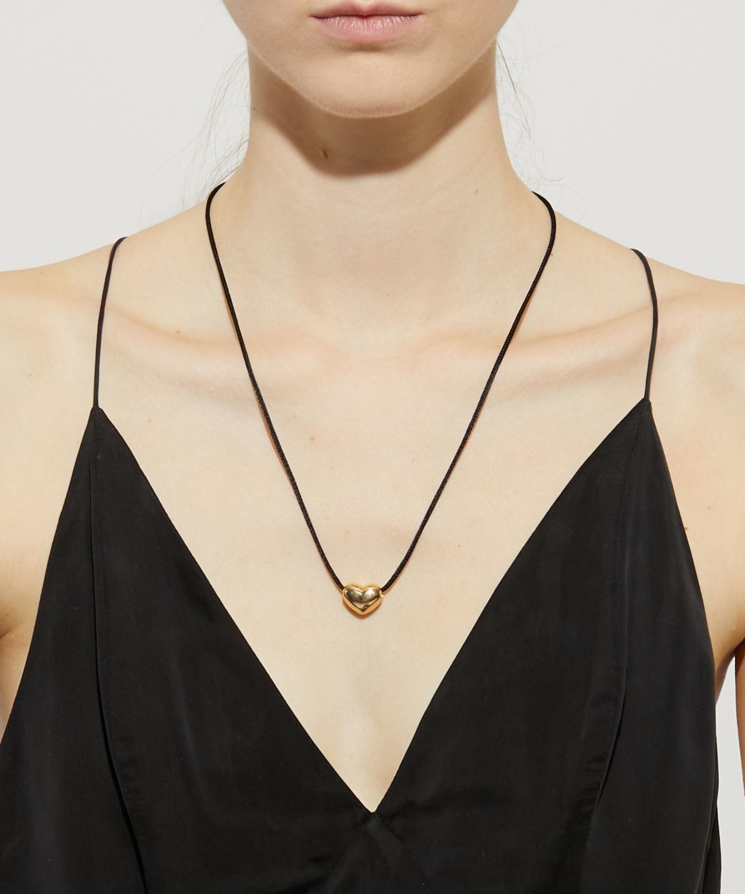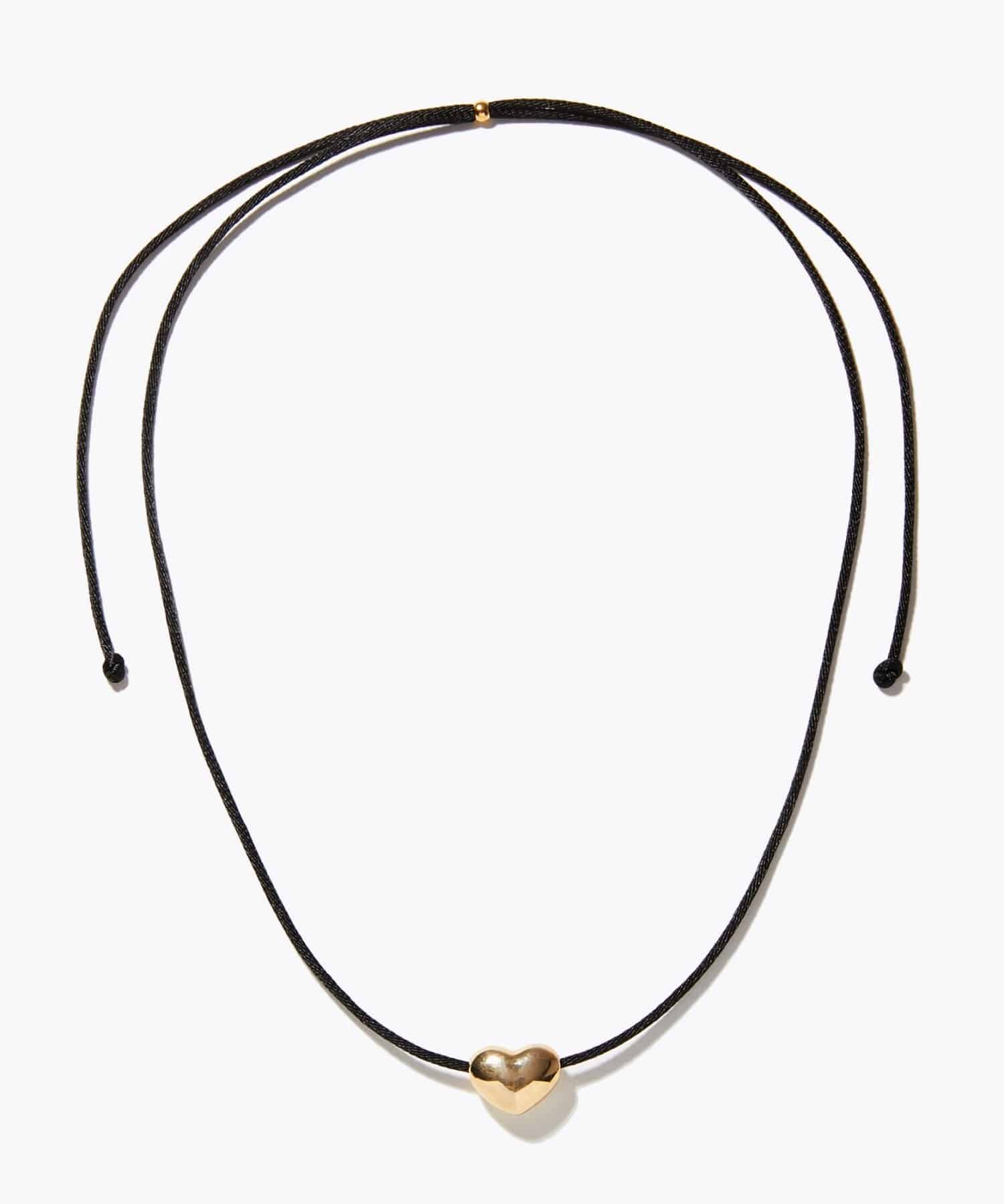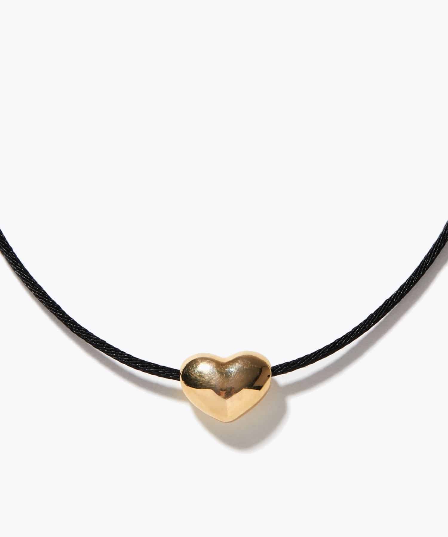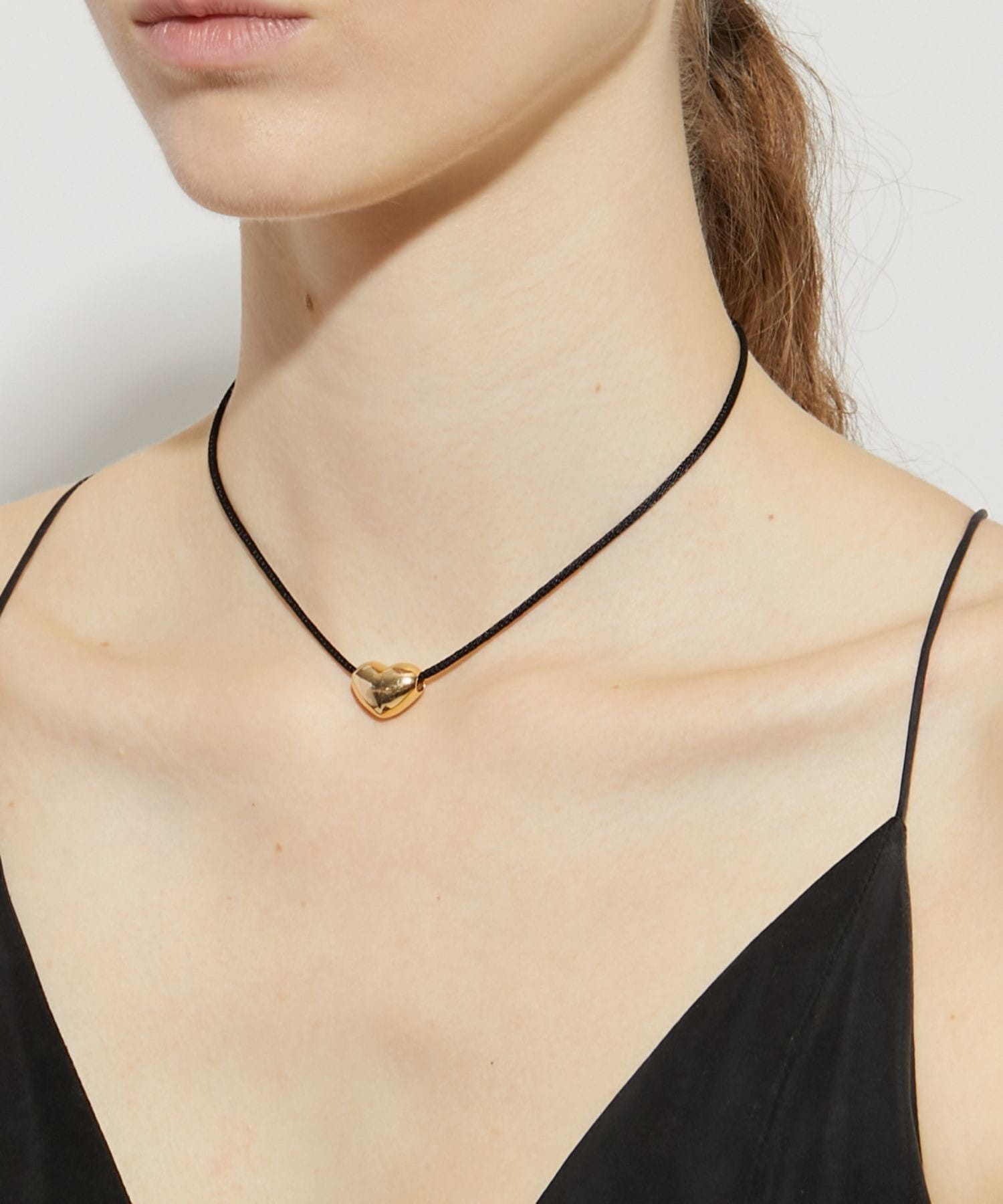 This choker features a plump gold heart that glitters softly in the light. The minimalist black cord enhances its brilliance, adding a modern touch. The length can be adjusted by changing the position of the clasp, so you can enjoy freely arranging it to suit your style.